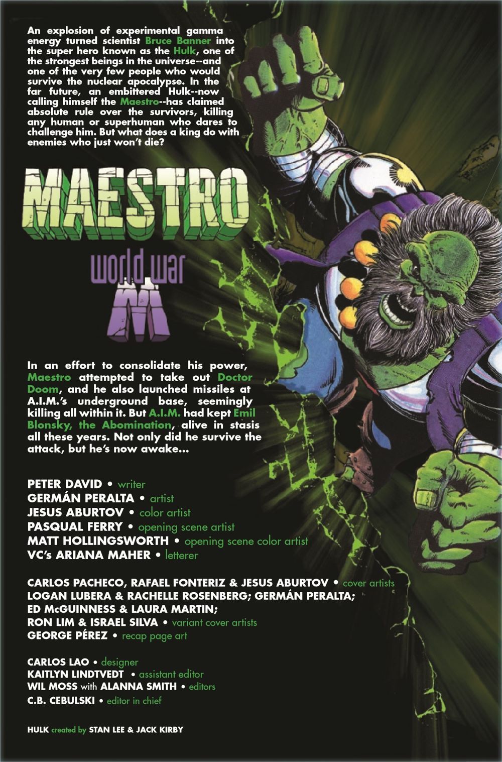 THE FINAL CHAPTER OF PETER DAVID'S MAESTRO TRILOGY BEGINS! A.I.M., the Pantheon and even Doctor Doom have all fallen before the might of the Maestro! Finally, he may now reign over his kingdom with a firm green fist. Except he didn't count on the Abomination rising from the dead and forming an alliance with Namor and Doom! And this dangerous new alliance is ready for war - WORLD WAR M!