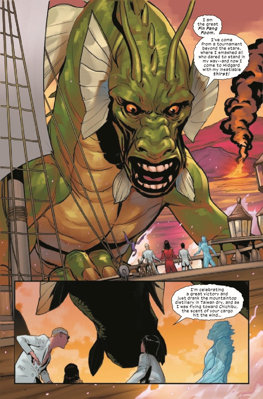 HOW TO FIGHT YOUR DRAGON! While a new representative of Krakoa hits the international stage, the Marauders find themselves face-to-snout with He-Whose-Limbs-Shatter-Mountains-and-Whose-Back-Scrapes-the-Sun, FIN FANG FOOM himself!