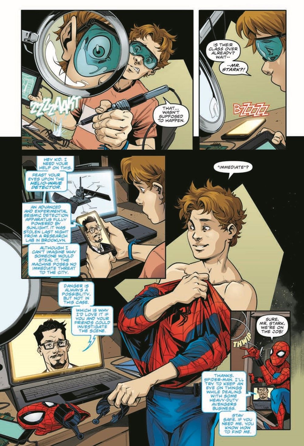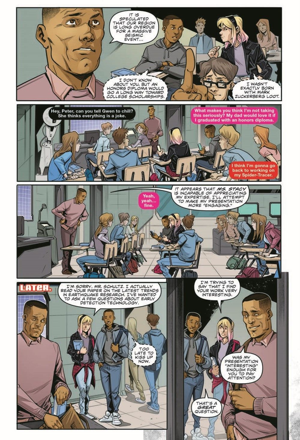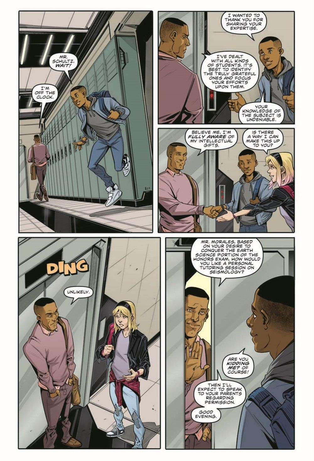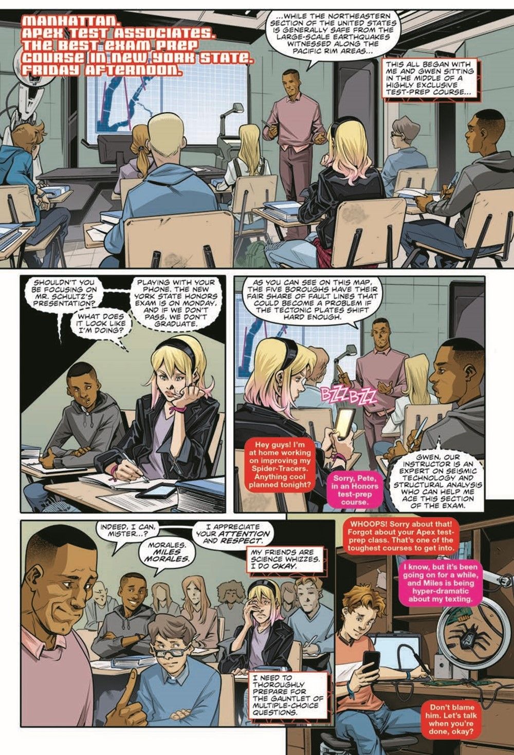 Your favorite wall-crawler is back in action, and he's not alone! Middle-grade readers can get tangled up in these all-new adventures of Spider-Man! A sinister new villain appears! Miles and Gwen are preparing for the biggest test of their high school careers, but will they stay focused with the team all shook up over their newest foe, the Shocker? And can they overcome his bad vibes with the exam putting their very futures at stake? Collects issues #1-3.