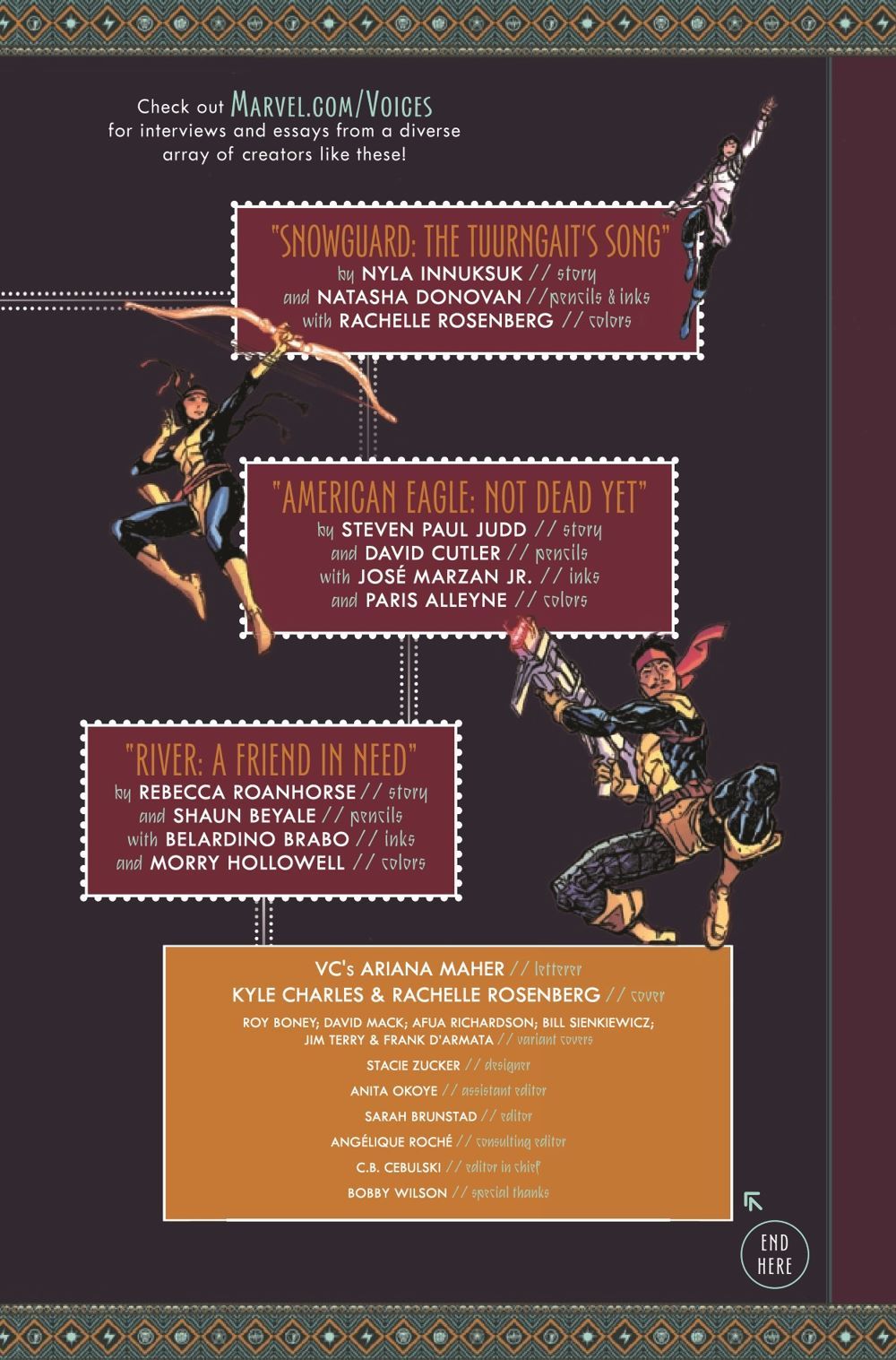THE HIT VOICES SERIES CONTINUES WITH AN EXTRAORDINARY ARRAY OF INDIGENOUS TALENT! Year two of Marvel's Voices kicks off with a celebration of Indigenous characters and talent! Get the full story behind River, the mysterious stranger from the pages of Rebecca Roanhorse's new ECHO series! Discover Snowguard's greatest hopes and fears in a tale by celebrated filmmaker Nyla Innuksuk! And many more reveals to come. New and established creators explore the wonders of the Marvel Universe – catch the next big wave here!