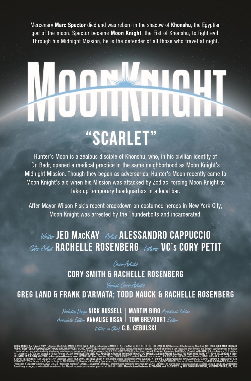 "Welcome to the Midnight Mission. My name is Doctor Moon. How can I help?" Moon Knight may be indisposed in the wake of the DEVIL'S REIGN, but the mission continues. In his absence, an erstwhile ally takes up the fight, but will the mystery of Stained-Glass Scarlet prove to be too much for Hunter's Moon, the Fist of Khonshu?