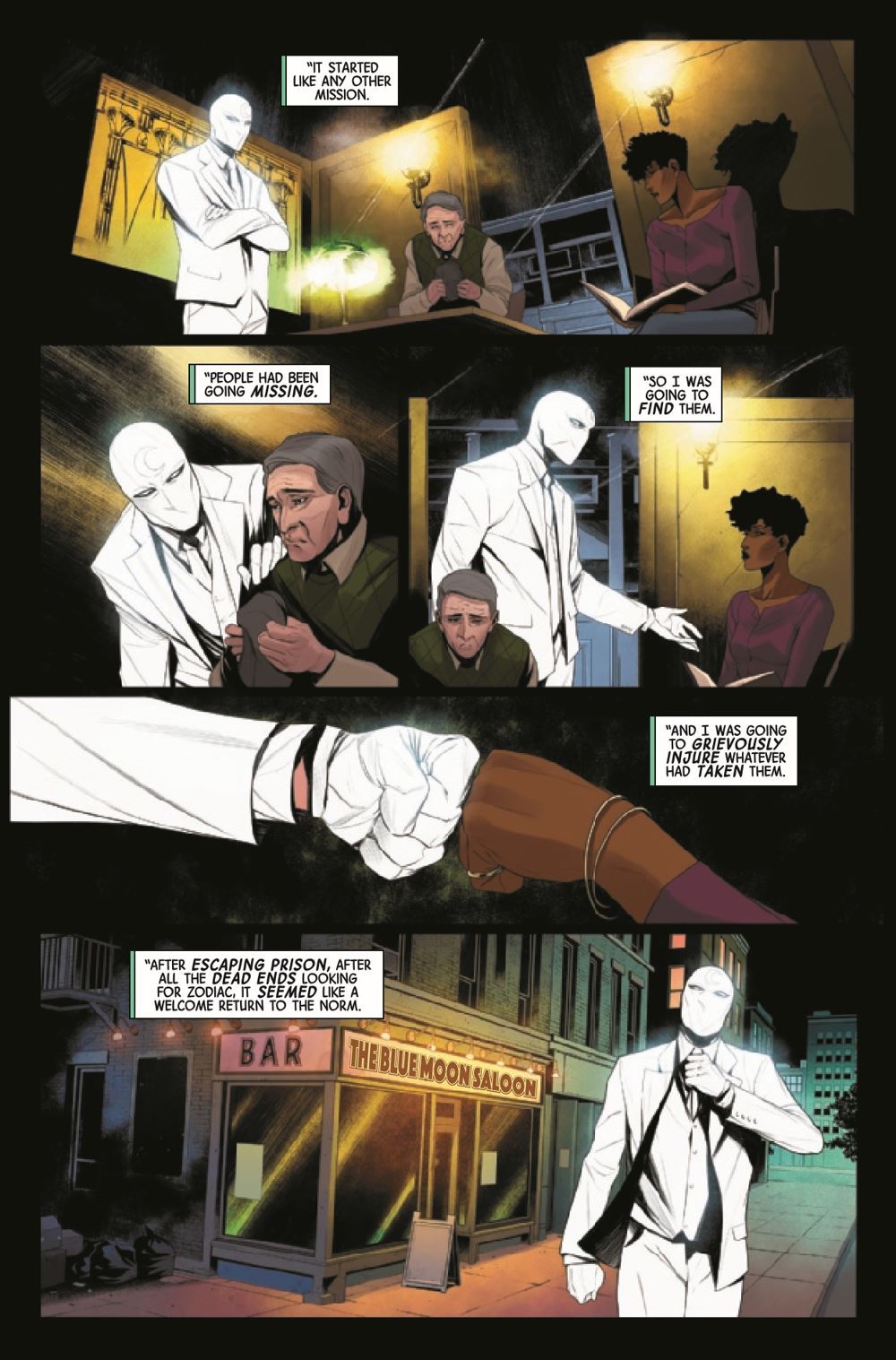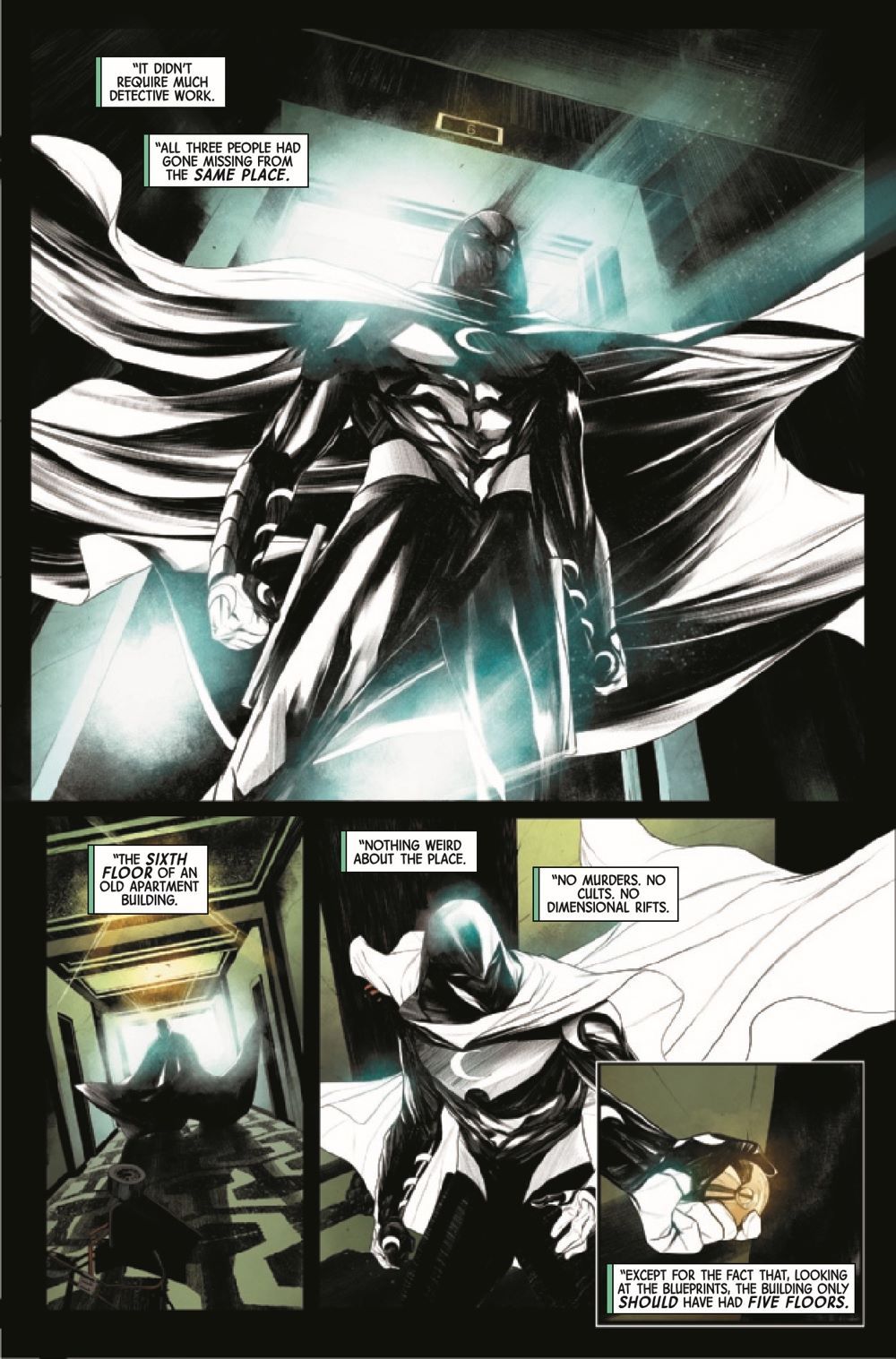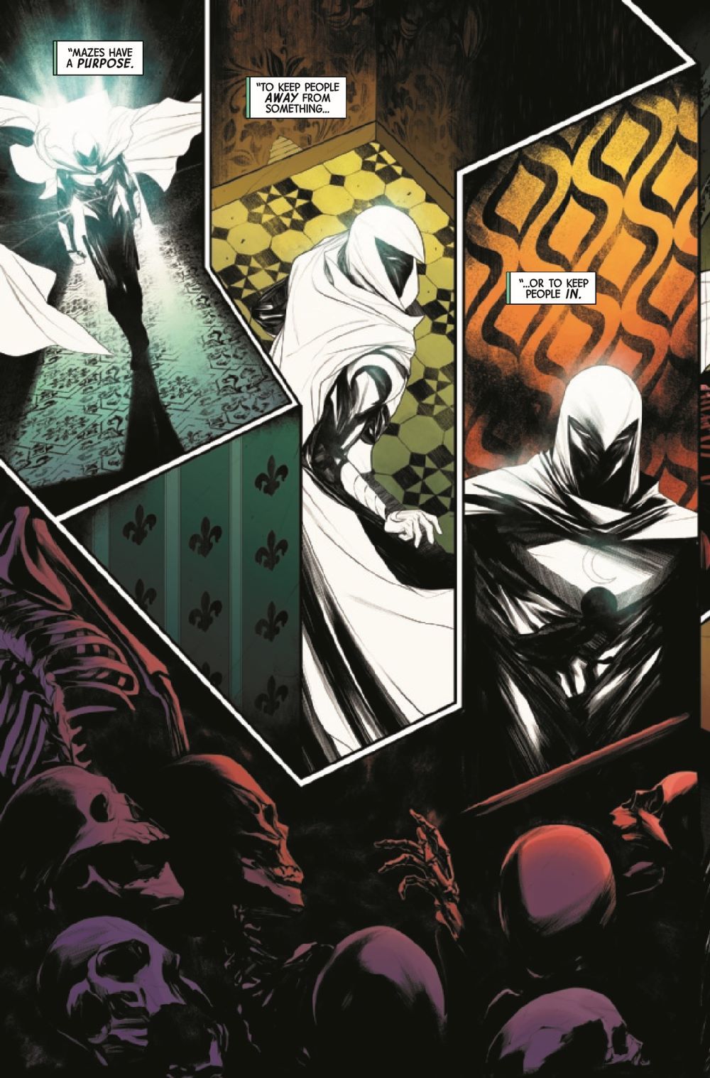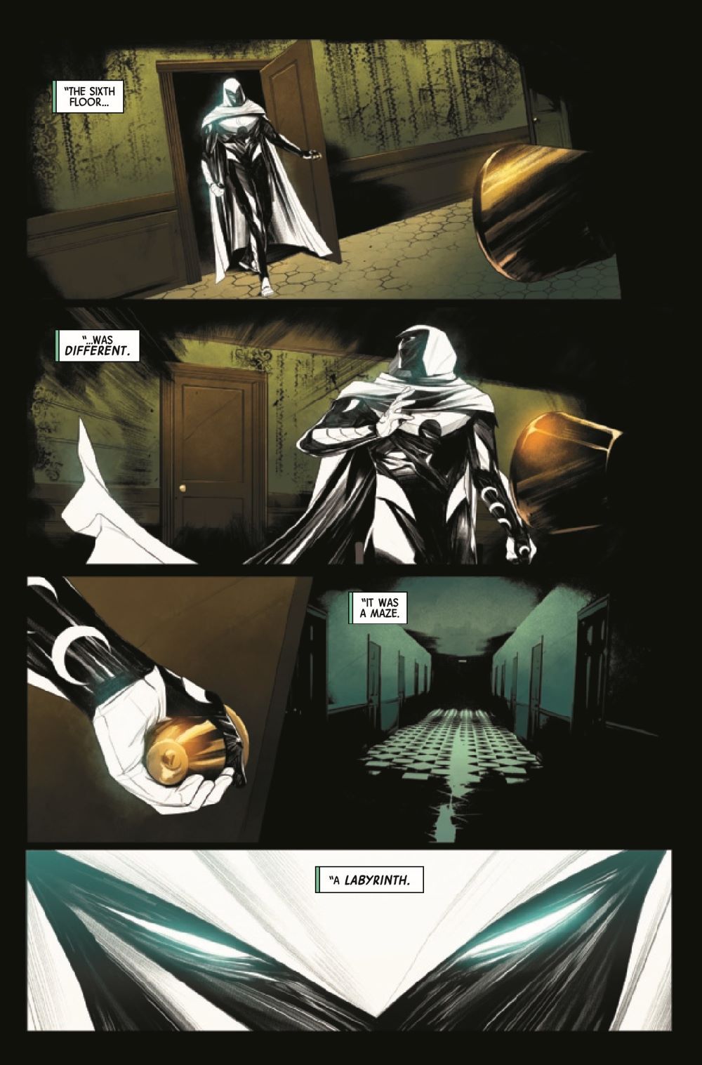 Mazes have one of two purposes: to keep people out or to keep people in. An unnatural labyrinth has swallowed up people under Moon Knight's protection - but how do you fight a maze? How do you kill a labyrinth? And will Moon Knight emerge victorious, or will his body and mind be broken by the Fifth Floor?