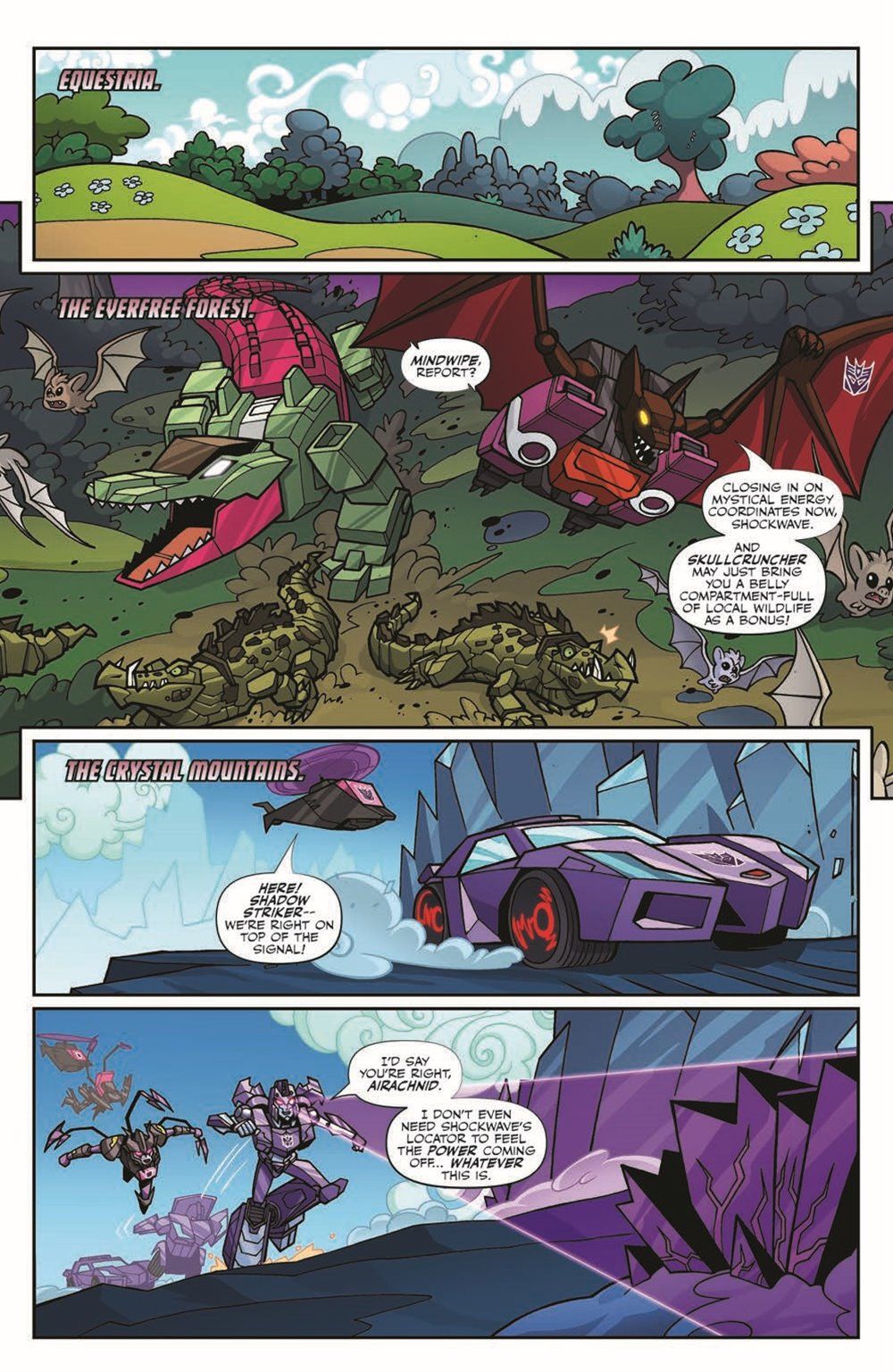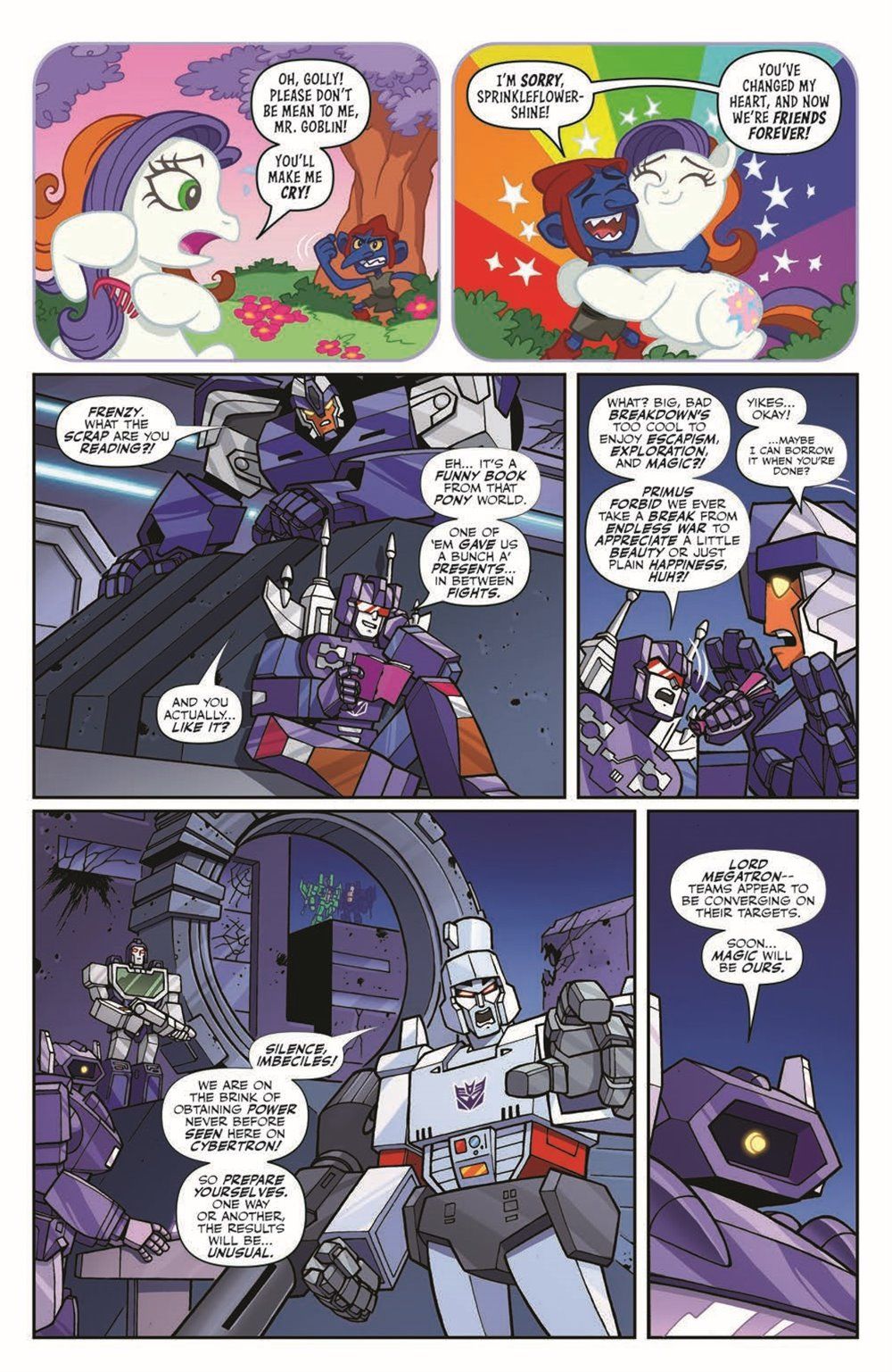 While using a modified Spacebridge to bring magic to Cybertron, the Decepticons end up unleashing a more powerful evil from Equestria than they ever could've imagined—looks like the only way out of this one is to team up! More ponies, more bots, and more magical mayhem as two worlds collide in the return of this hit crossover event!