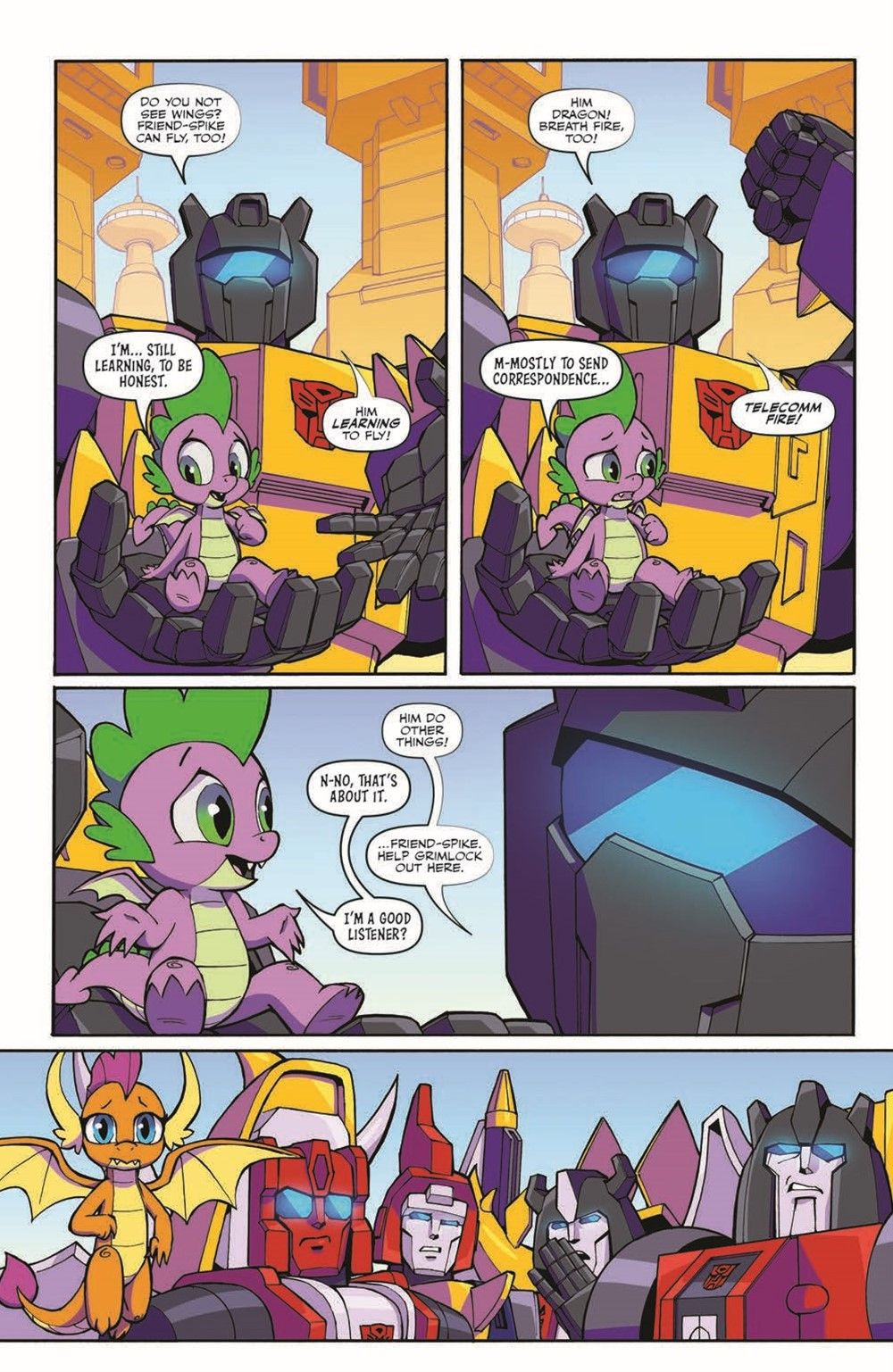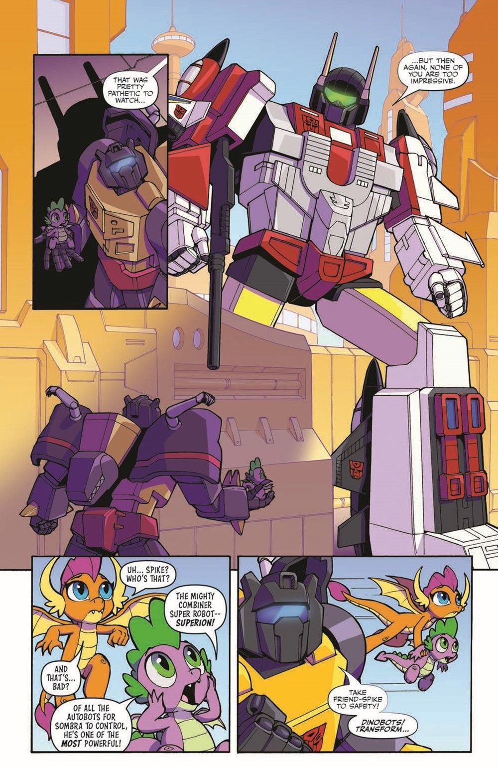 Spike and Grimlock return! When the Dinobots are attacked by Sombra's minions, can Grimlock's little purple buddy save every creature? And don't miss the epic conclusion to the hit crossover series! Is friendship really magic? Can Transformers and ponies really work together? And how in the world are they going to stop Sombra?!
