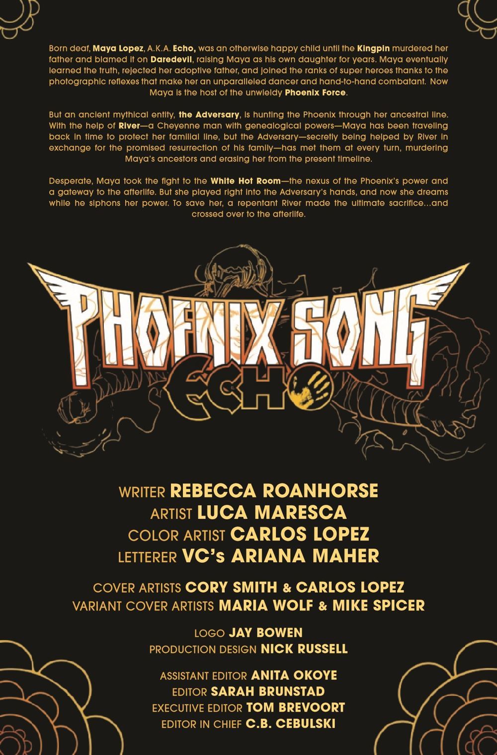 THE END IS NEAR! WHO WILL RISE? As the threads of Maya Lopez's life unravel, Forge and River face the Adversary in the White Hot Room! In the final chapter of Rebecca Roanhorse's blazing series, the ultimate battle of will and strength will determine if Echo can rise from the ashes of the Adversary's nefarious manipulations.