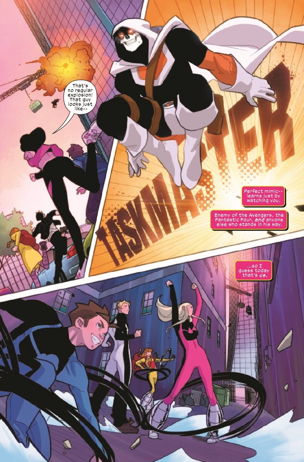 The Power Pack is in over their heads (metaphorically) as their powers are (literally) about to start misbehaving and shutting down! Only they don't know that yet, which is what's known to STUFFY OLD LITERATURE PROFESSORS as "dramatic irony" and known to everyone else as "oh dang, that's some exciting and suspenseful comic soliciting!" Sophocles used it! Shakespeare used it! Now it is our turn to experience dramatic irony. As if that weren't enough, the Power Pack faces ANOTHER threat they never saw coming, delivered to them by special guest...TASKMASTER! Honestly, given how badly things are going, it really seems that one or more of the Power Pack should die in this issue. DO THEY? Heck, you'll have to buy this (Julie-narrated!) issue to find out!