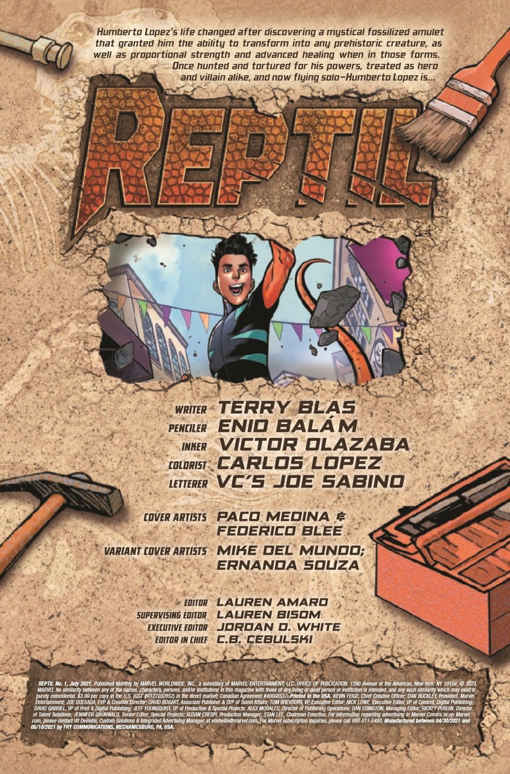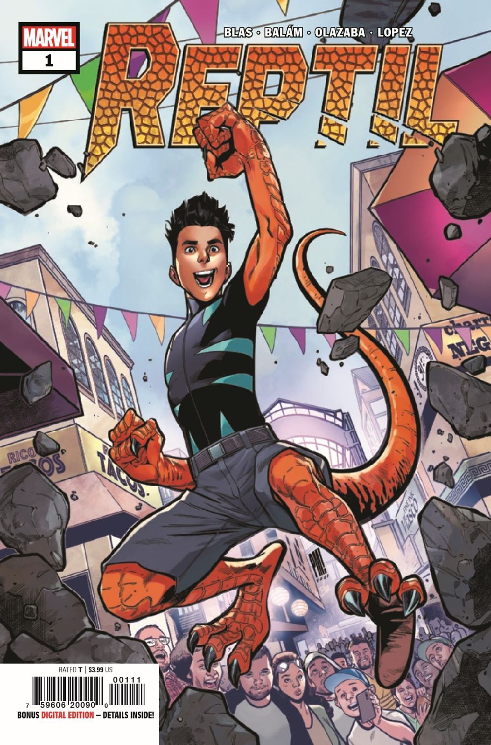 REPTIL ON THE BRINK OF EXTINCTION! In the wake of Kamala's Law and his Grandfather's worsening health, Humberto Lopez, A.K.A. Reptil, has taken a step back from crime-fighting to refocus on his family. Perhaps its a sign that he should give up on becoming a hero and finally come to terms with his parents' mysterious disappearance...or perhaps not! When a mysterious figure ambushes Humberto, what unravels will shake the core of everything Humberto thought he knew about his past and will either change the course of his future-or end it forever! Don't miss out on this breakout series from rising stars Terry Blas (HOTEL DARE, DEAD WEIGHT: MURDER AT CAMP BLOOM) and Enid Balám (OMNI)!