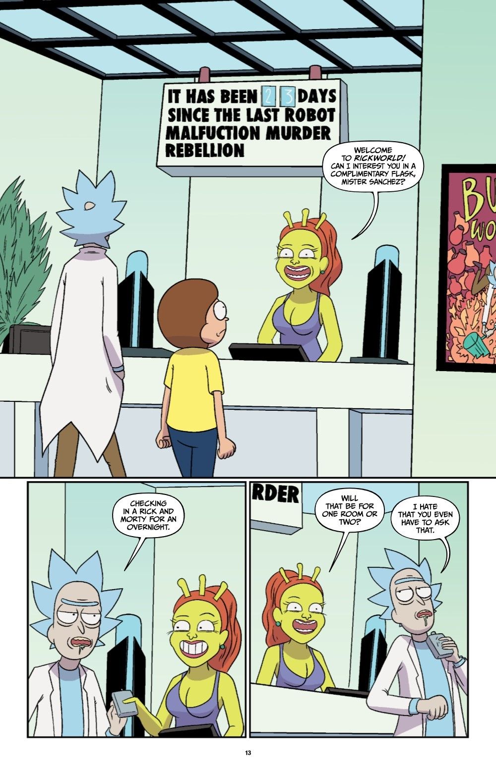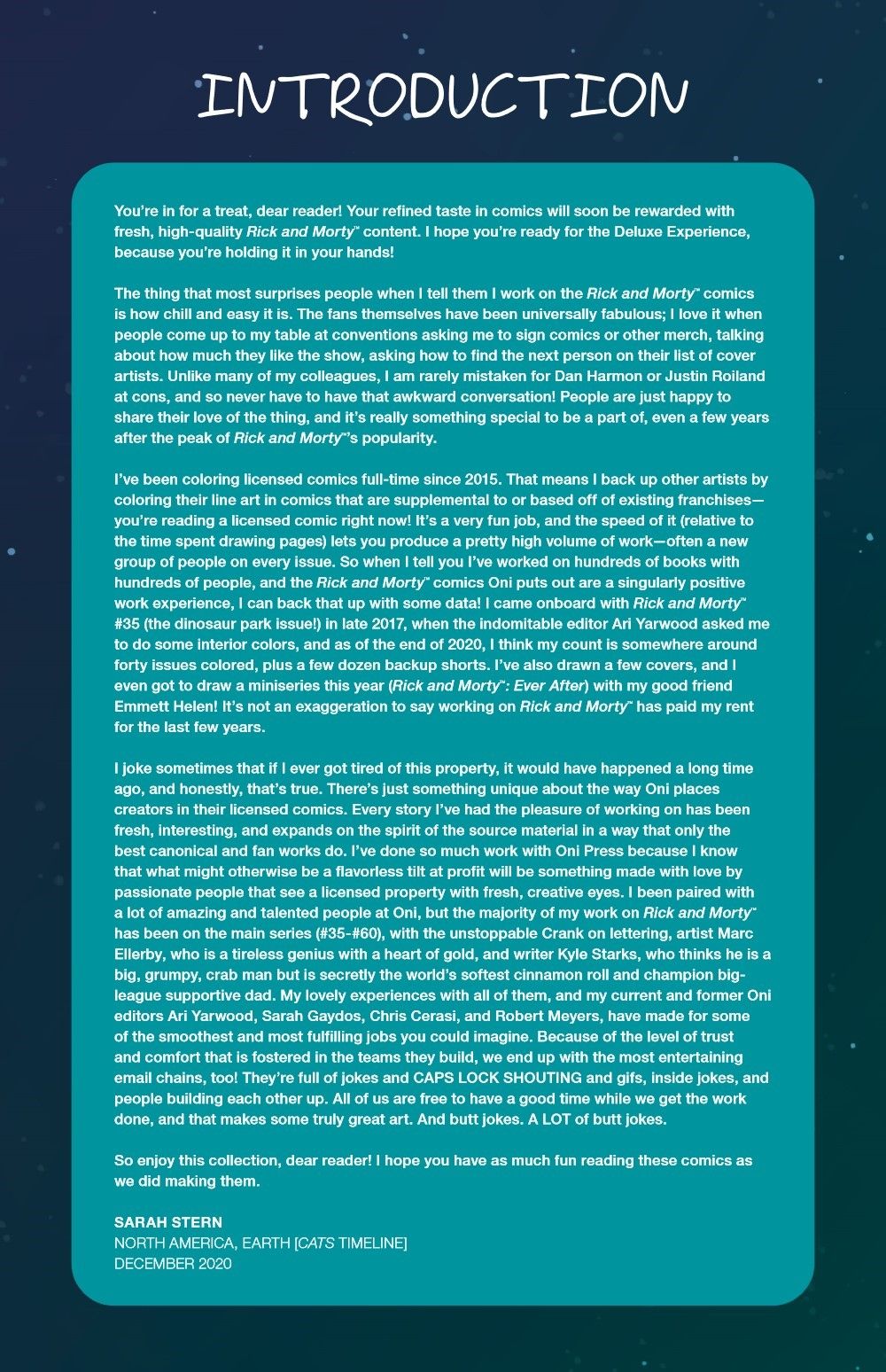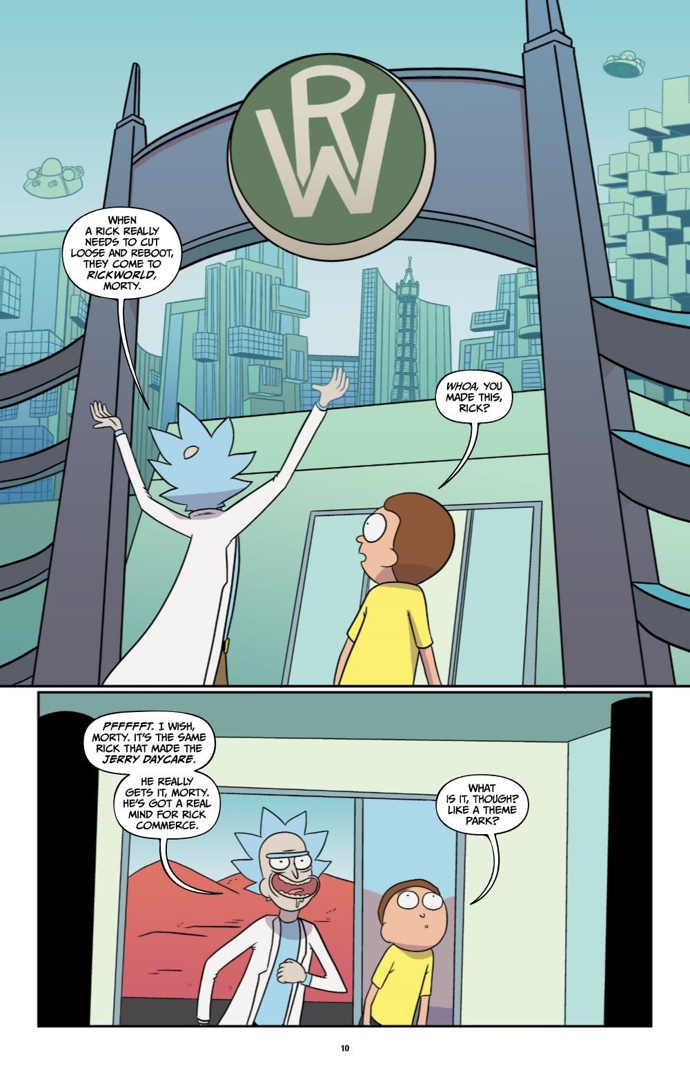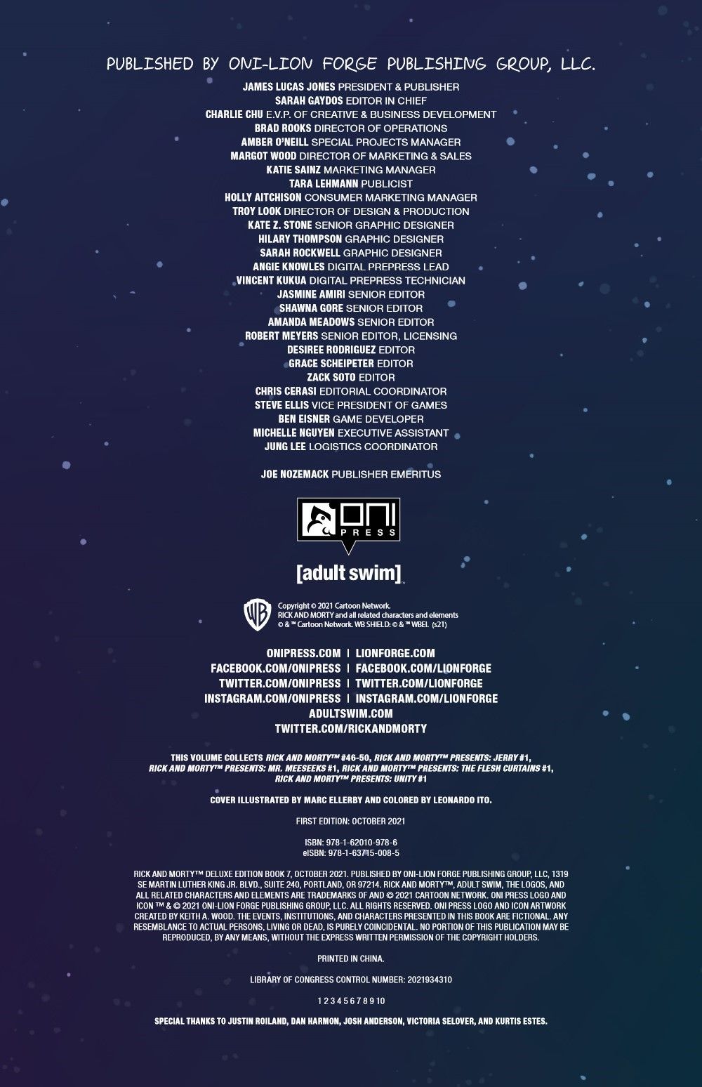 Collecting issues #46-50 of the hit series, and Rick and Morty Presents: Jerry #1, Rick and Morty Presents: Mr. Meeseeks #1, Rick and Morty Presents: The Flesh Curtains #1, Rick and Morty Presents: Unity #1, this deluxe edition starts with five stories of Rick and Morty madness, like the time where Morty takes it too far and Rick really needs to blow off some steam. Where better to do that than "RickWorld," where every Rick can live out his every fantasy?! Plus, an episode of Interdimensional Cable, interrupted in the weirdest way possible! Next up: Jerry's got a job, Morty's got a girlfriend, even Beth's happy! Something is terribly, terribly wrong, and Morty has to figure it all out. And don't miss a very special story where Rick and Morty experience their very own Groundhog Day!