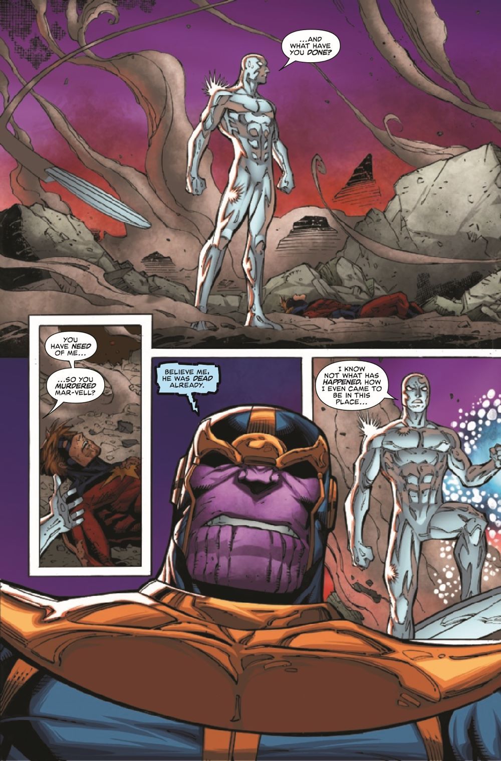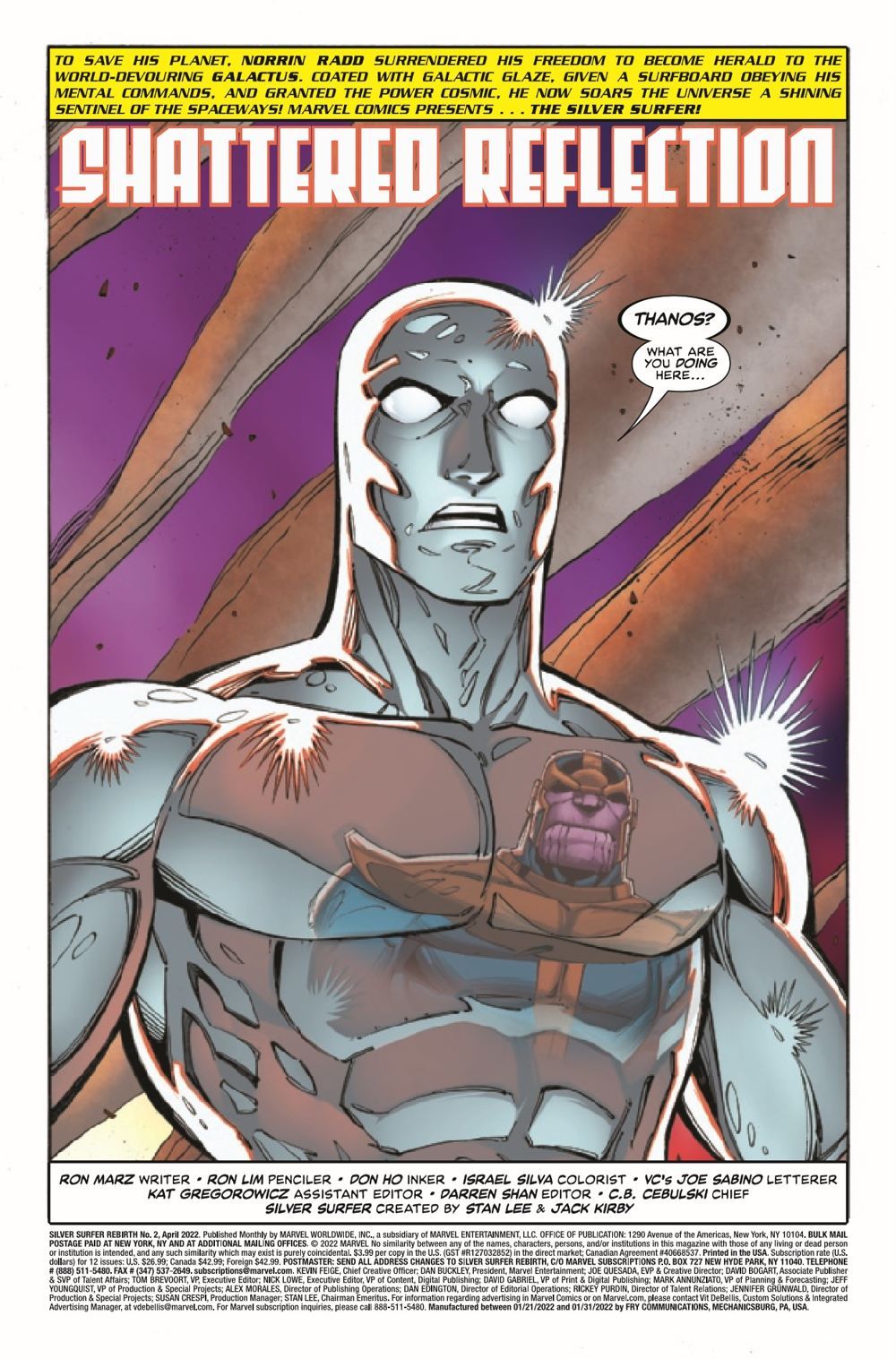 A MIGHTY MARVEL TEAM-UP?! NOT LIKELY… Someone has stolen the Reality Gem and is restructuring the universe to their whims…and it's NOT Thanos! Now, the Silver Surfer must do the unthinkable and team up with his worst foe to save all of existence. If only they could just stop trying to kill each other…