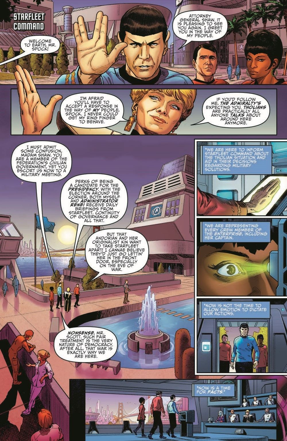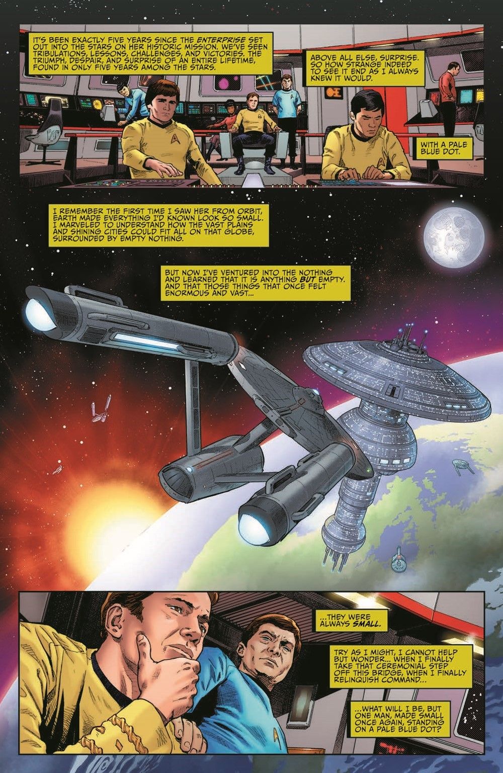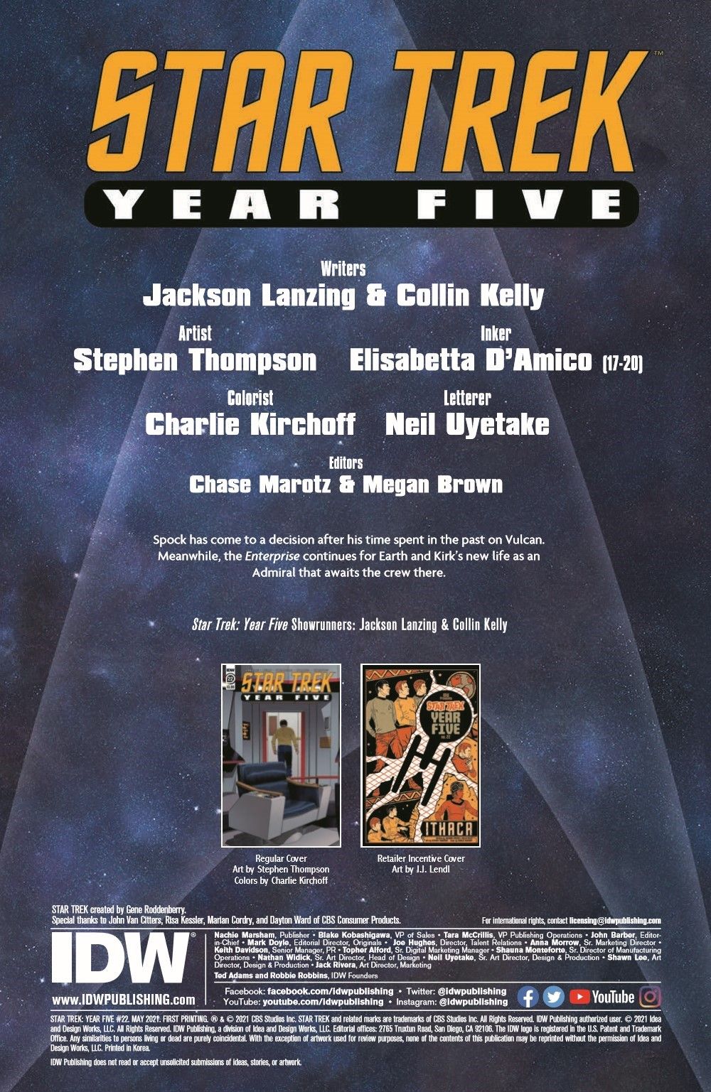 For five years, the U.S.S. Enterprise and her crew have journeyed to the edge of the known universe, tackling impossible challenges and menacing foes along the way. But the biggest challenge of all awaits them here at home… and no matter what happens, the lives of Captain Kirk and his crew will be changed forever. The grand finale of Star Trek: Year Five begins here with a new issue from showrunners Jackson Lanzing & Collin Kelly (Gotham City Garage, Green Arrow) and artist Stephen Thompson (Satellite Falling, Die Hard: Year One).
