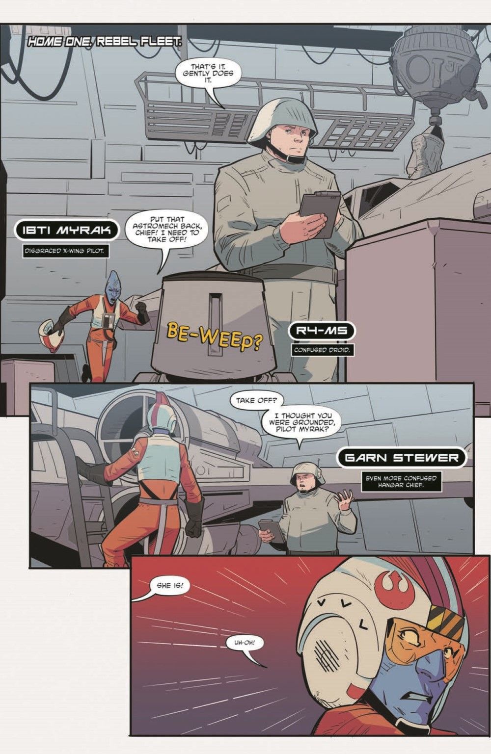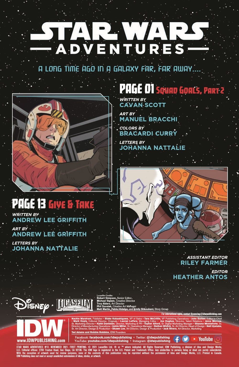 First, it's a trap! Luke Skywalker and Rogue Squadron has been snared by the Empire. But who is the traitor and why is new recruit Ibti Myrak fighting with Admiral Ackbar on the deck of Home One? X-Wings and TIE fighters clash in "Squad Goals," part two by Cavan Scott and Manuel Bracchi.