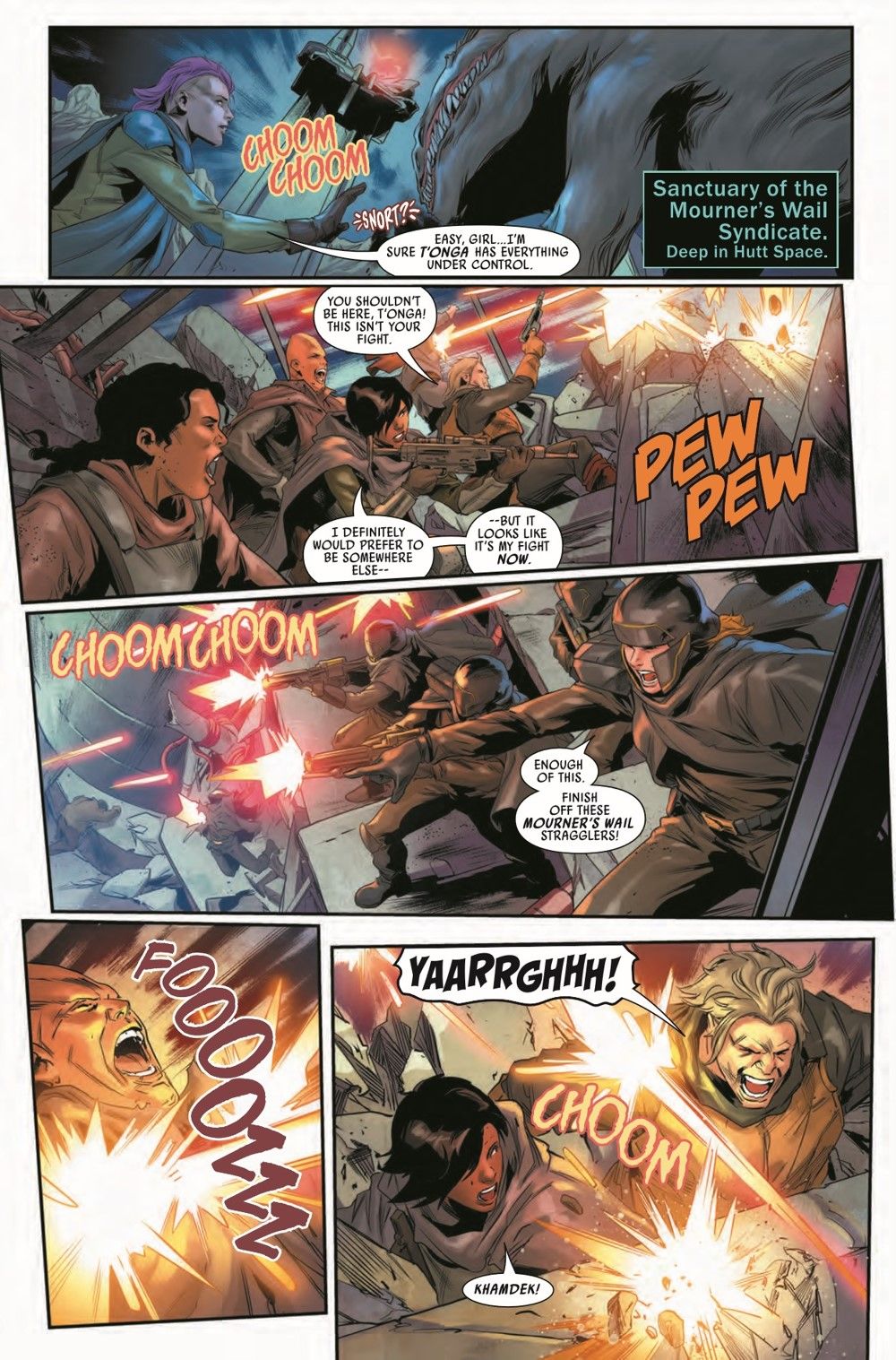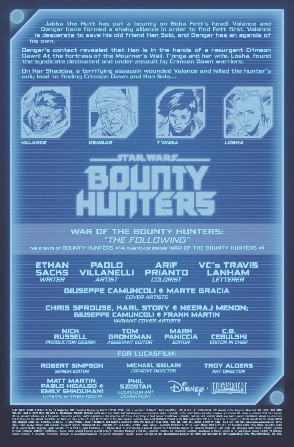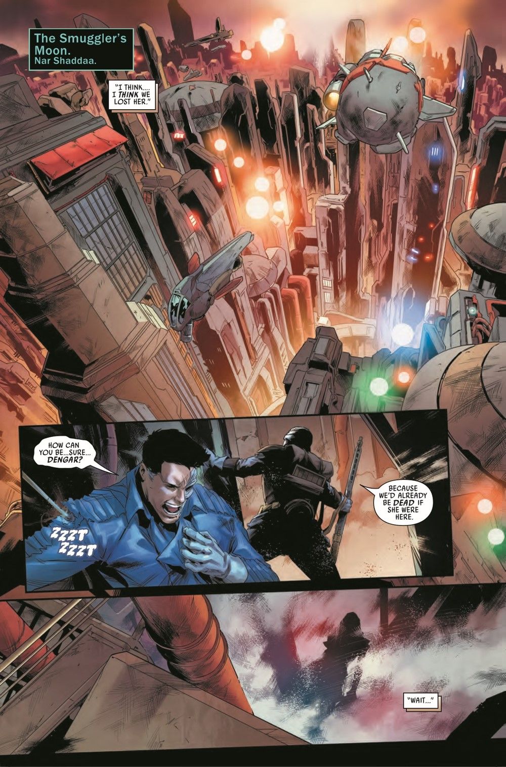 "THE FOLLOWING" Hunted by the mysterious assassin DEATHSTICK, a wounded VALANCE and his reluctant partner DENGAR are running out of options! T'ONGA is outgunned and outnumbered... but she does have one last surprise up her sleeve! And the shadowy force behind all of the danger makes its move!