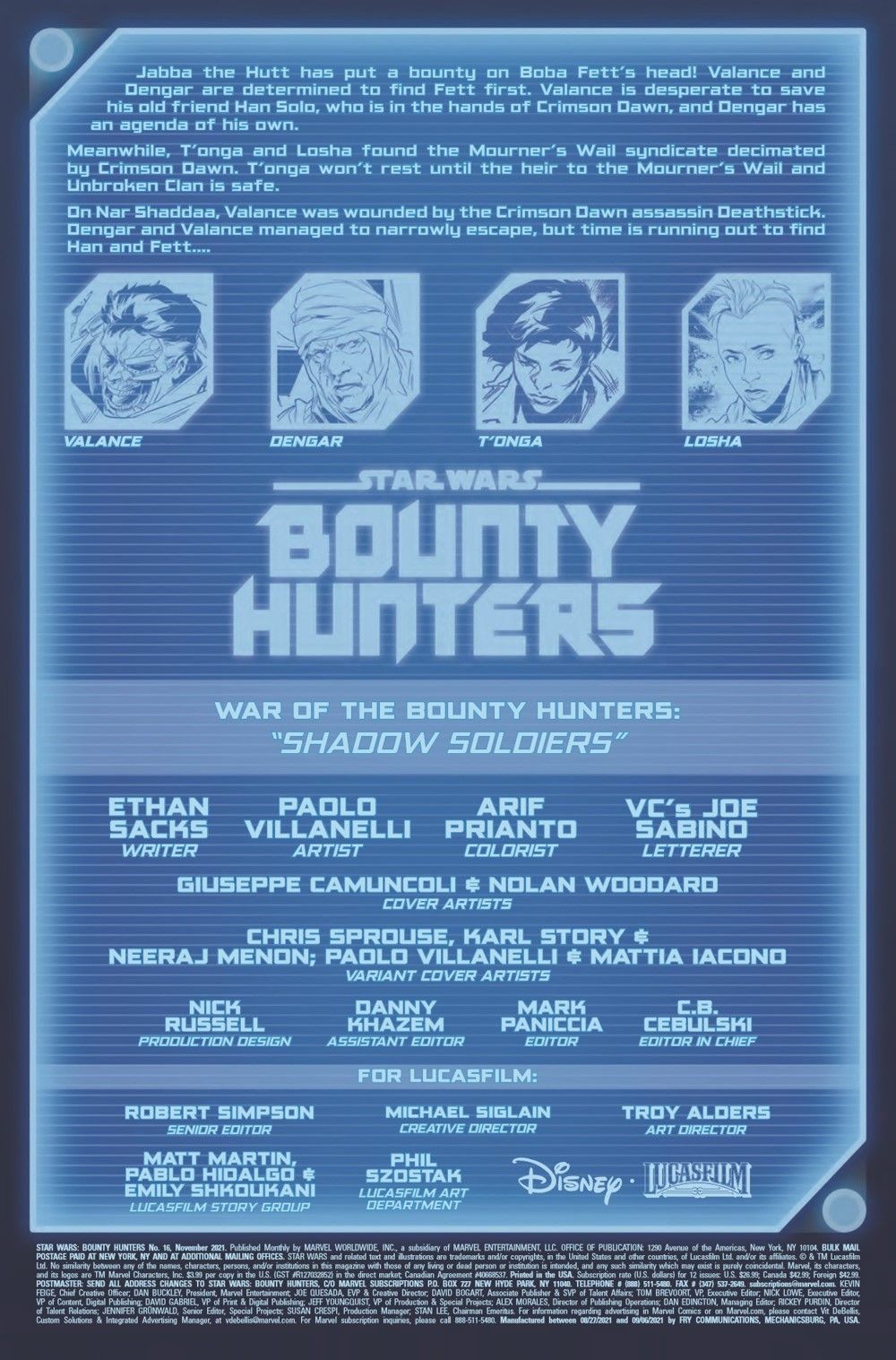 "SHADOW SOLDIERS" VALANCE and DENGAR make a last stand against DEATHSTICK! T'ONGA seeks help from a LEGENDARY BOUNTY HUNTER! The bounty hunters converge on a high-stakes auction as CRIMSON DAWN'S plans come into focus!