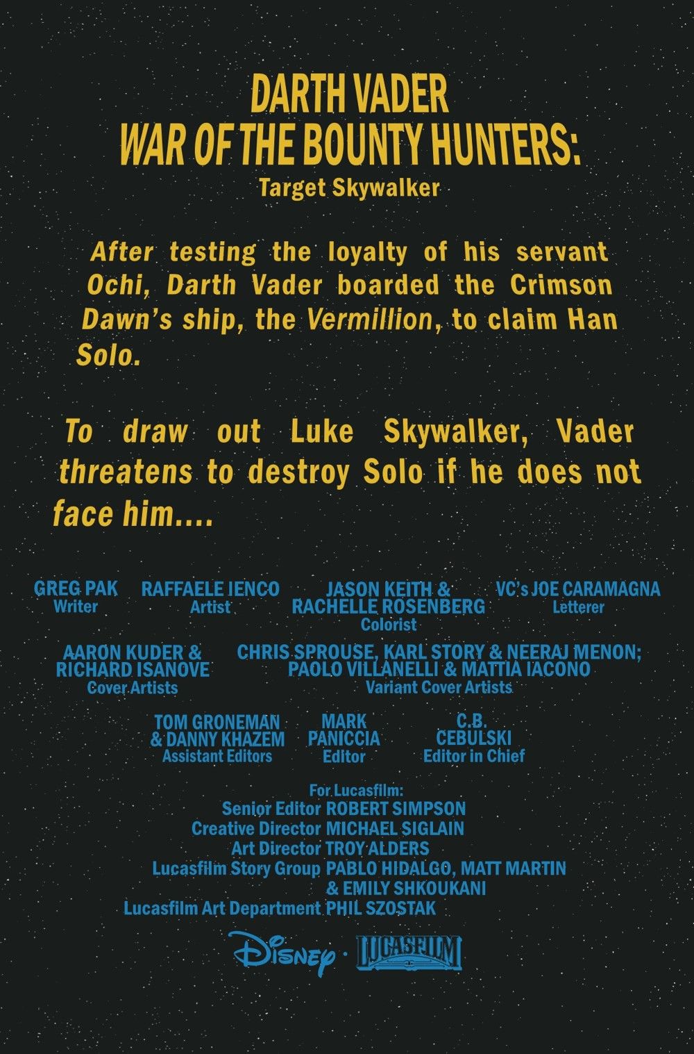 "TARGET SKYWALKER" All of DARTH VADER'S careful scheming and brutal power moves to claim HAN SOLO'S frozen body have one ultimate end goal: LUKE SKYWALKER, the only person who could challenge Vader's primacy at the Emperor's side. Now everything comes to a head as father closes in on son and Luke finally grasps a shocking truth... ...one that will shape his destiny FOREVER!