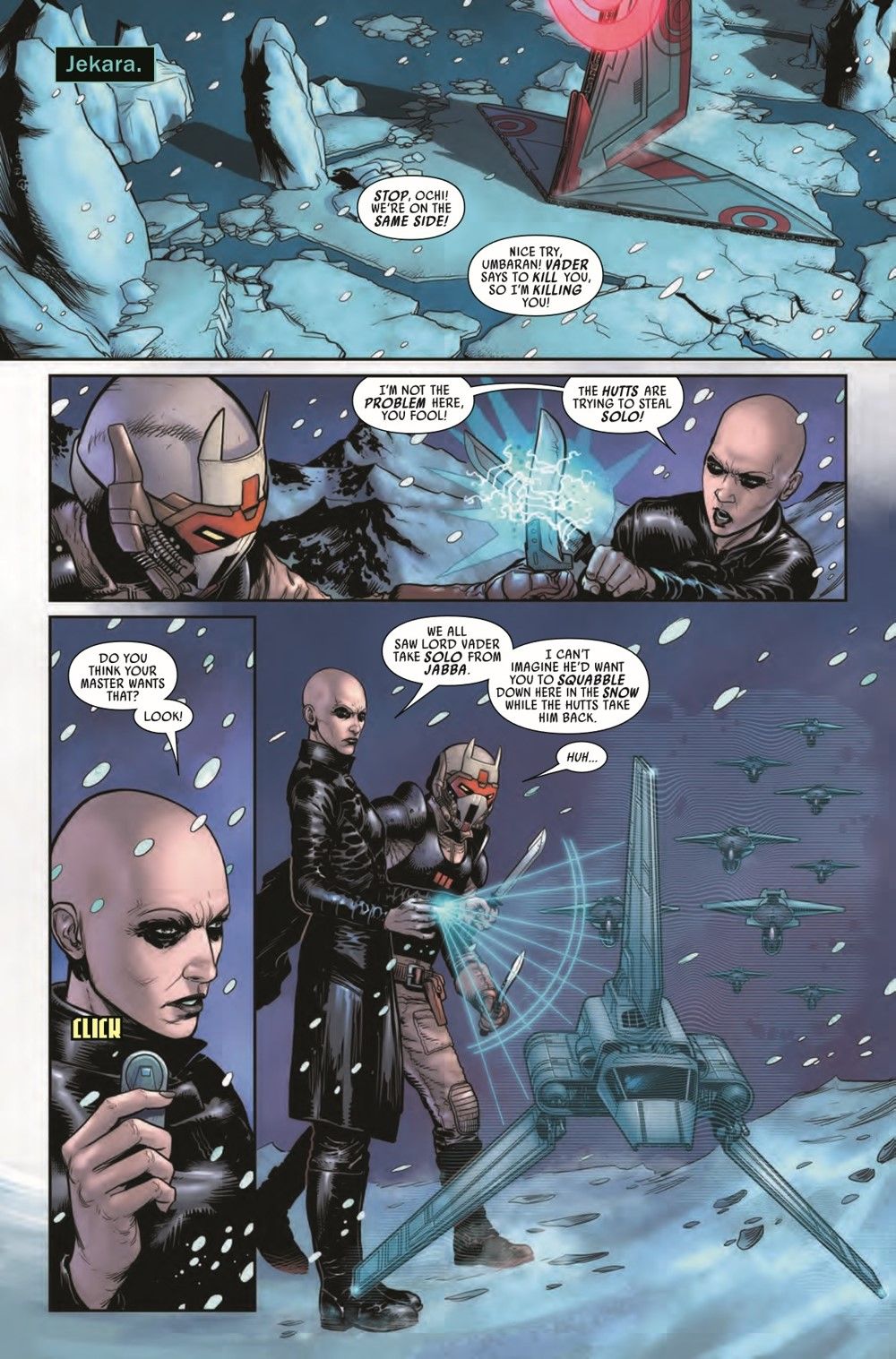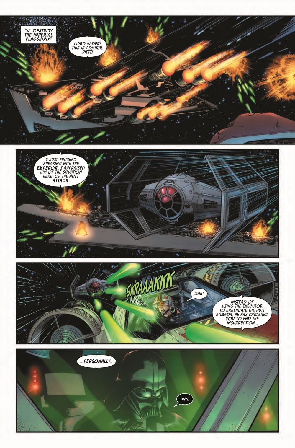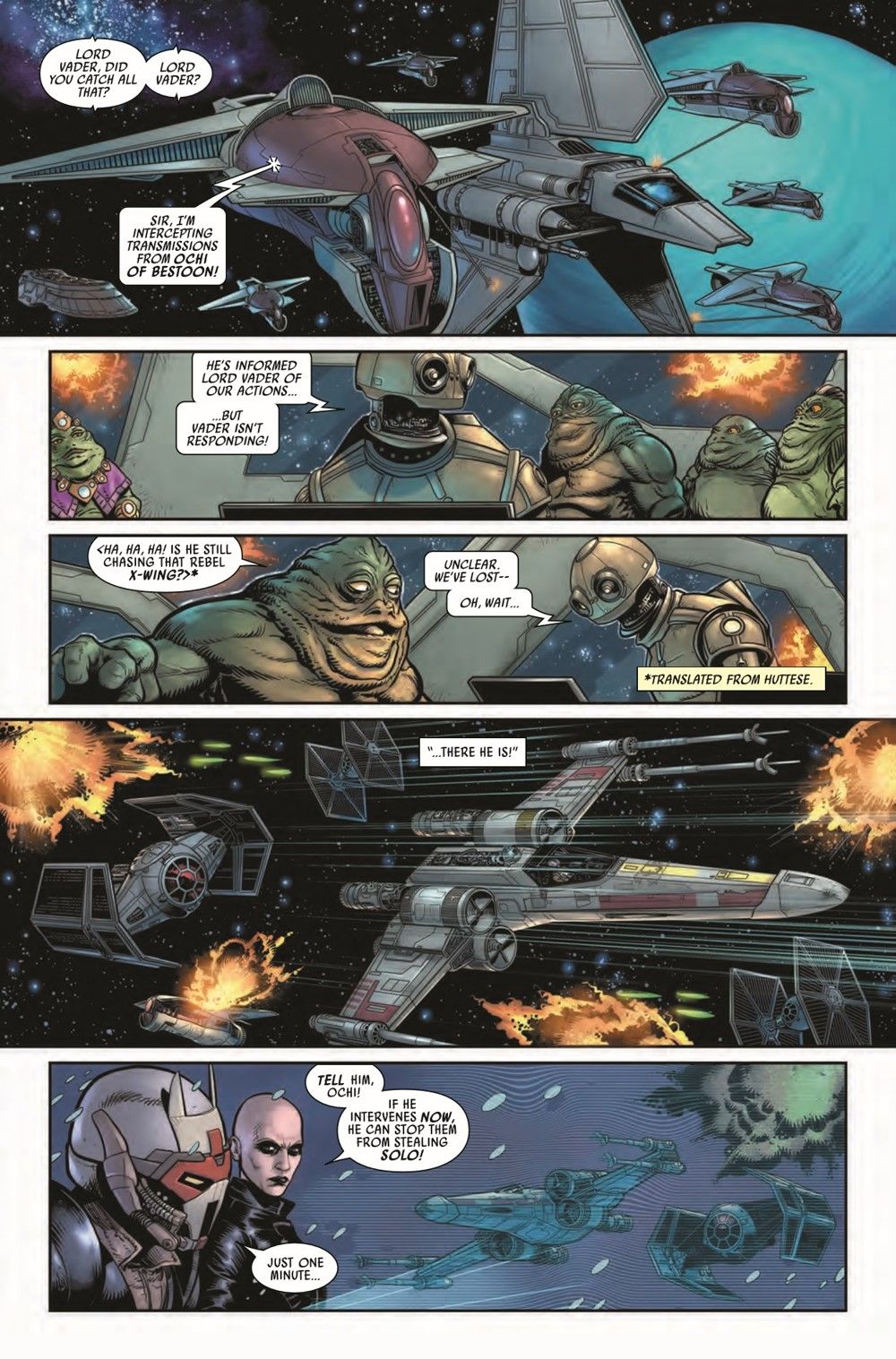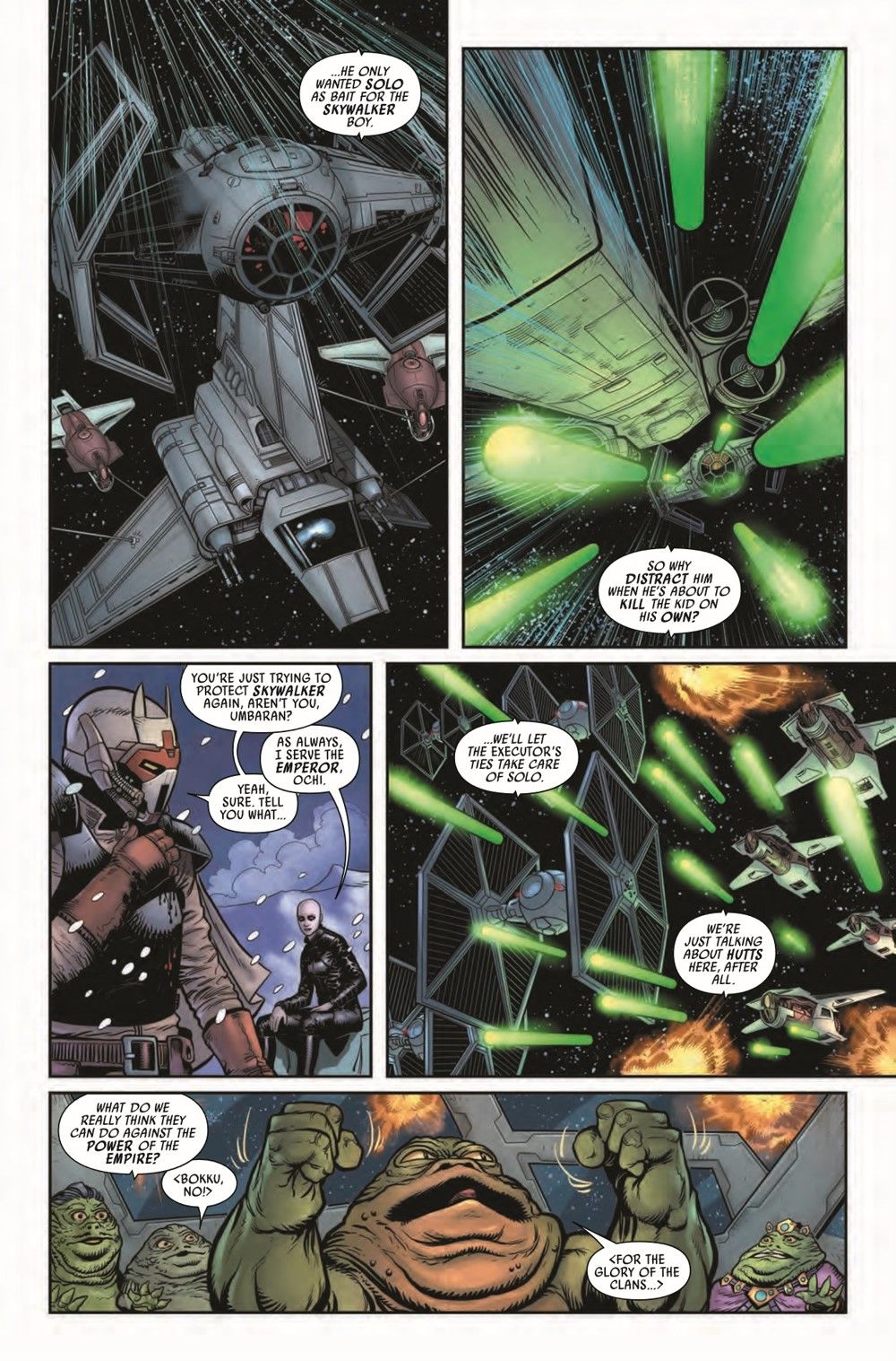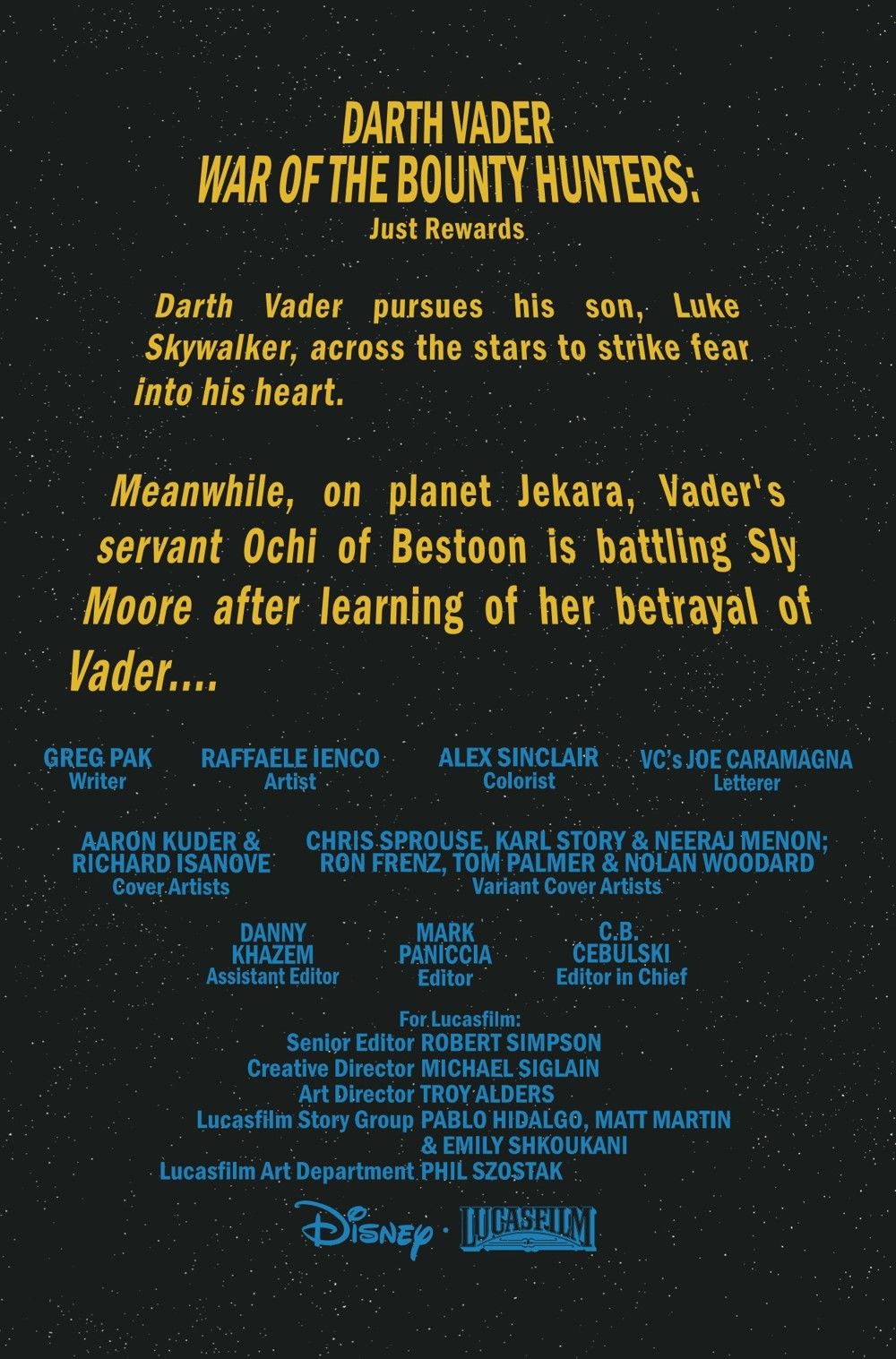 "JUST REWARDS" Throughout the search for HAN SOLO, DARTH VADER has carved his way through shadows, unraveling mysteries cloaked in deceptions and betrayal. Now Vader finally takes care of all his business in this blockbuster conclusion to the WAR OF THE BOUNTY HUNTERS story arc. But is he the true master of betrayal in this tale? Or is there another?