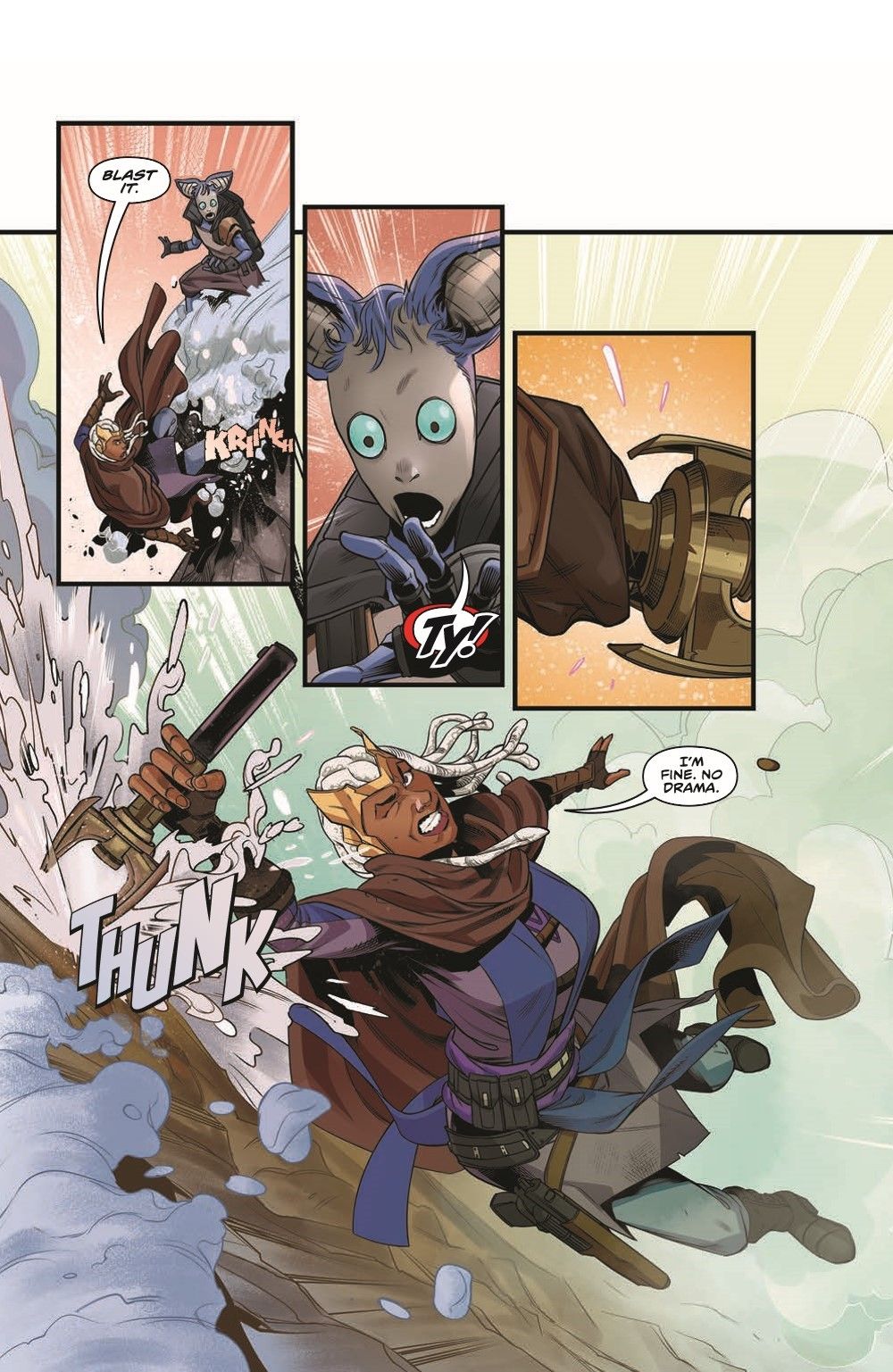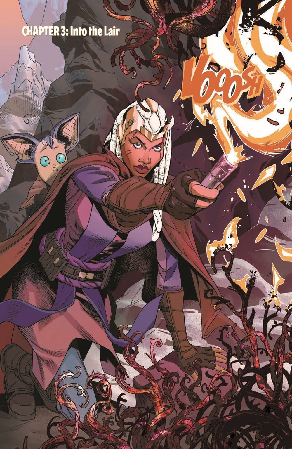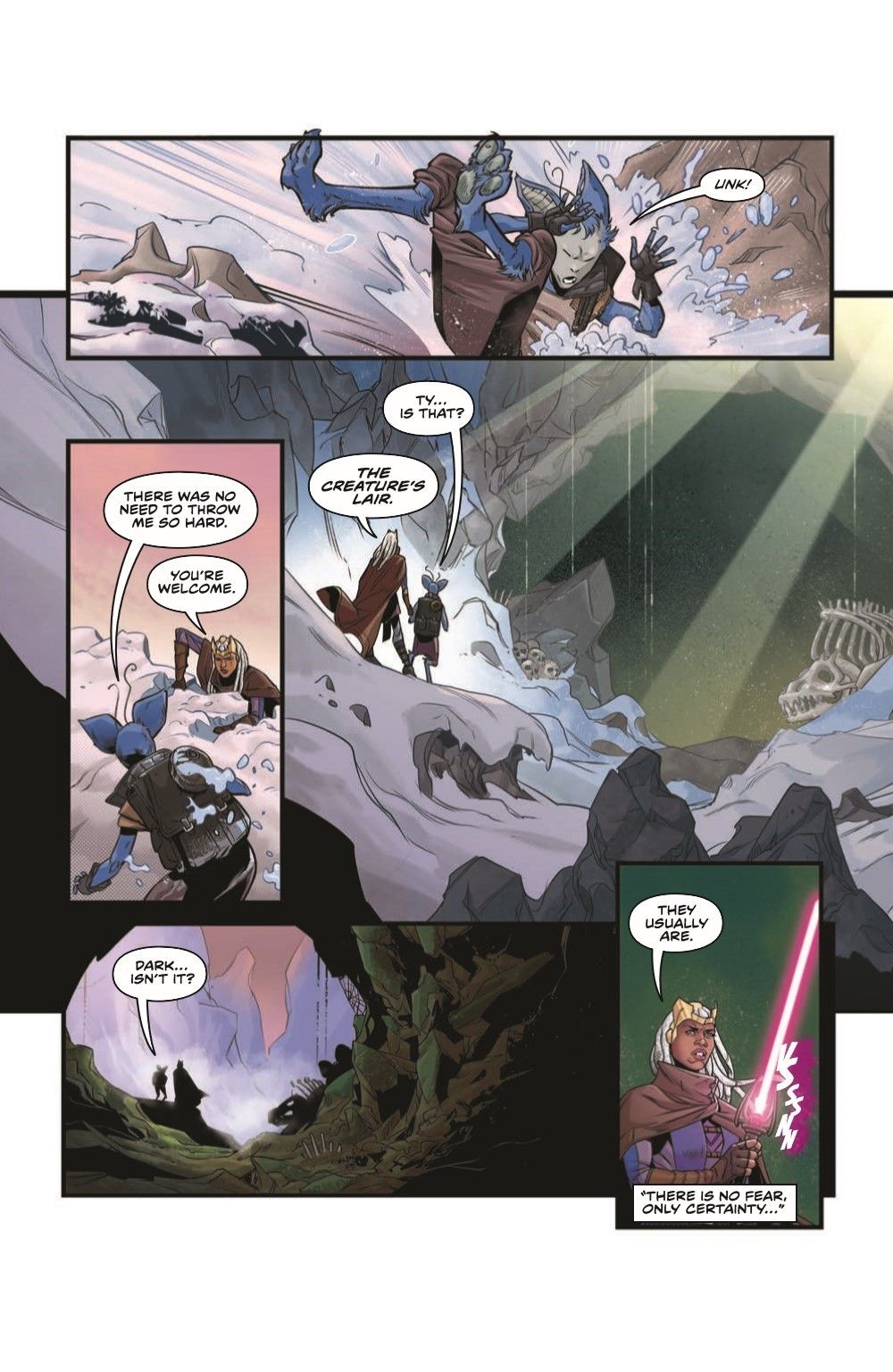 Follow former Jedi turned saber-for-hire monster hunter Ty Yorrick in this adventure-packed High Republic miniseries by Cavan Scott and Rachael Stott! The time has come—Ty has reached the Gretalx layer and now she must do what she does best: slay the beast! But during the battle, her rusty Force powers trigger a cave in, trapping her and Drewen with the monster. As the Gretalax and Rock Weavers close in on the pair, Ty feels an unexpected presence in the Force…