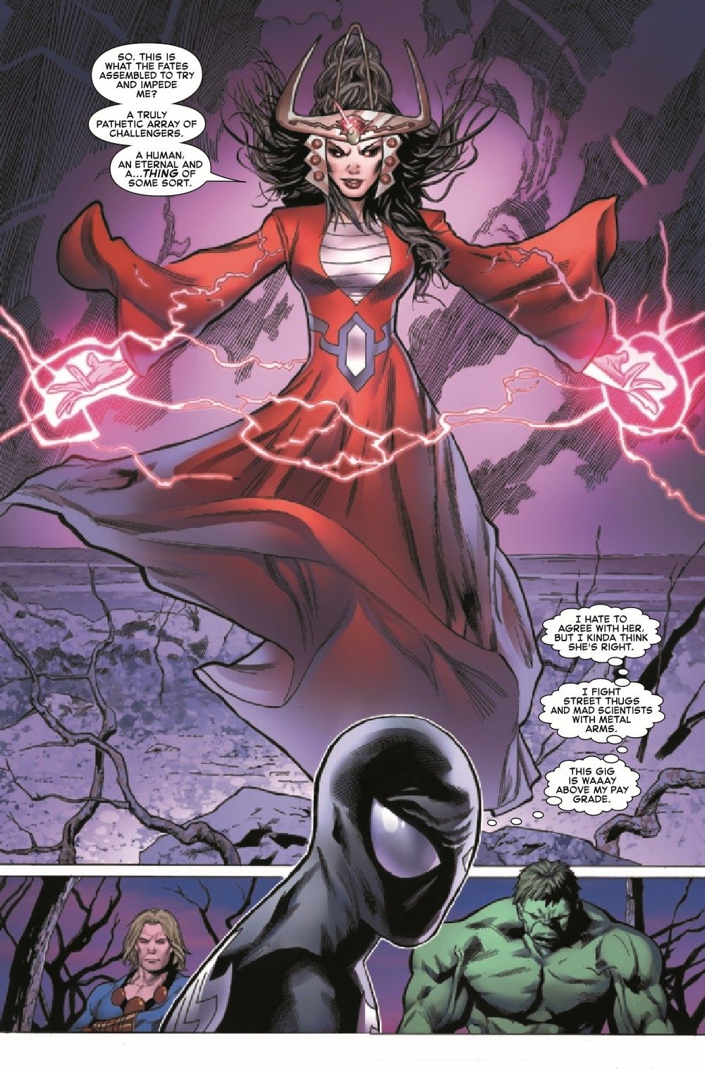 KARNILLA RULES! • The Queen of the Norns finally has what she wants, but are the combined efforts of SPIDER-MAN, DOCTOR STRANGE, THE INCREDIBLE HULK and THE ETERNALS enough to stop her? • Maybe not, but something ASGARDIAN this way comes!