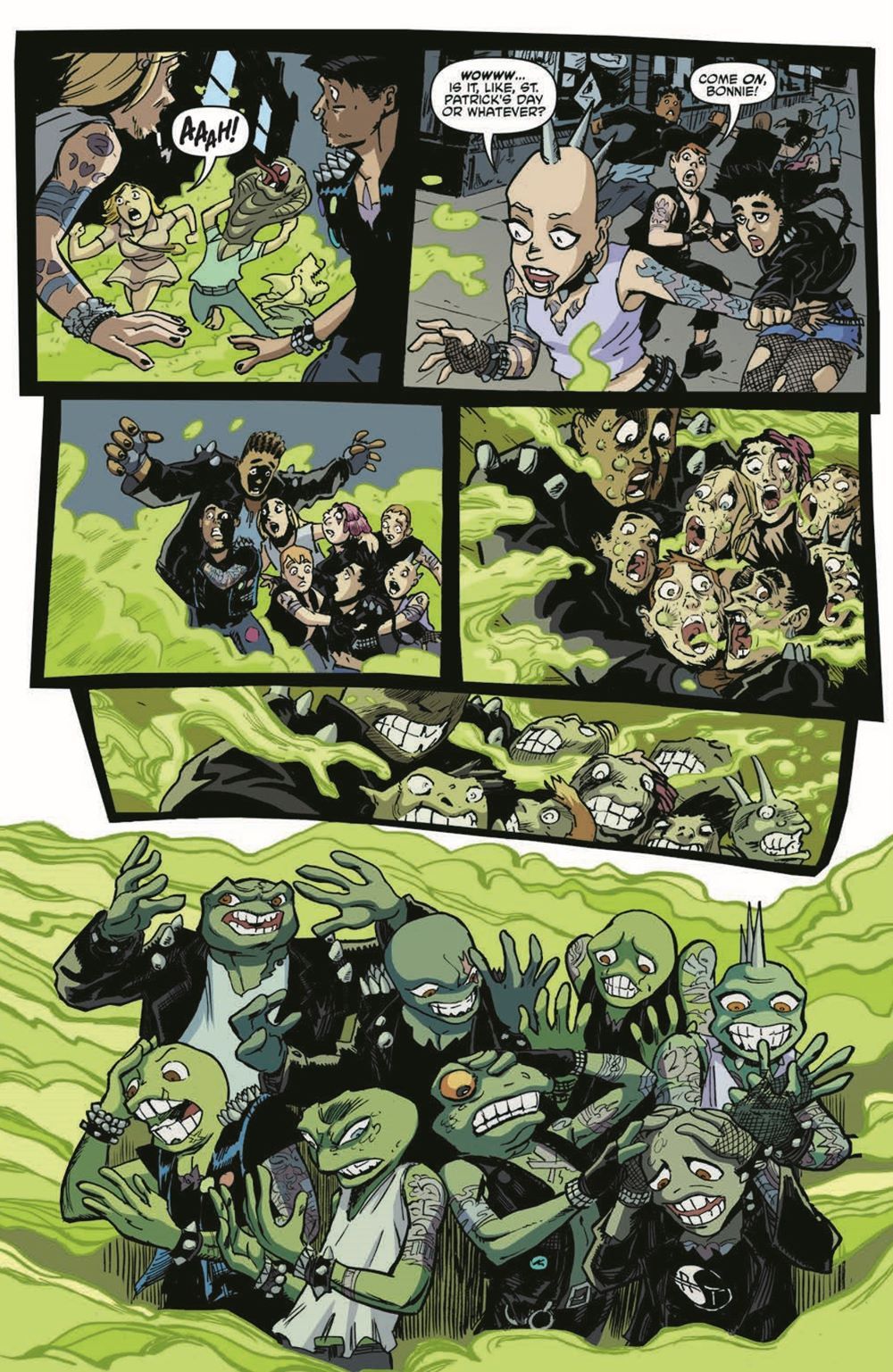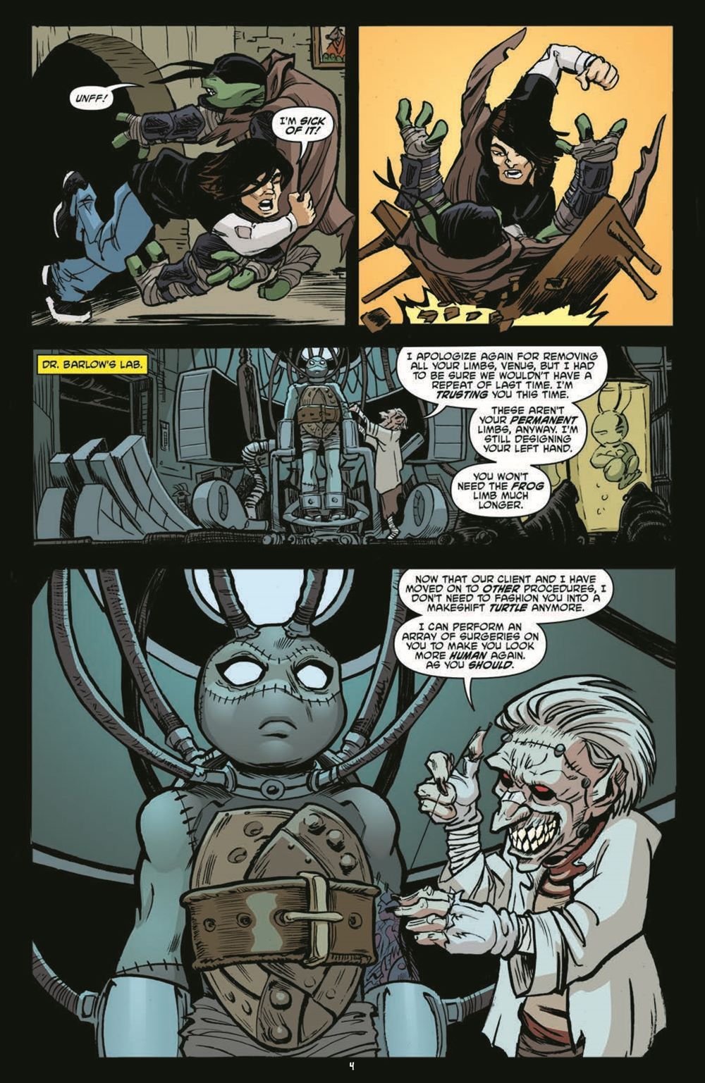 Donatello struggles to escape from the fiendish Dr. Barlow with help of the mysterious VENUS! The Turtles attempt to save him as well, but first they'll have to have a final showdown with the Punk Frogs! Continuing the long-awaited introduction of Venus!