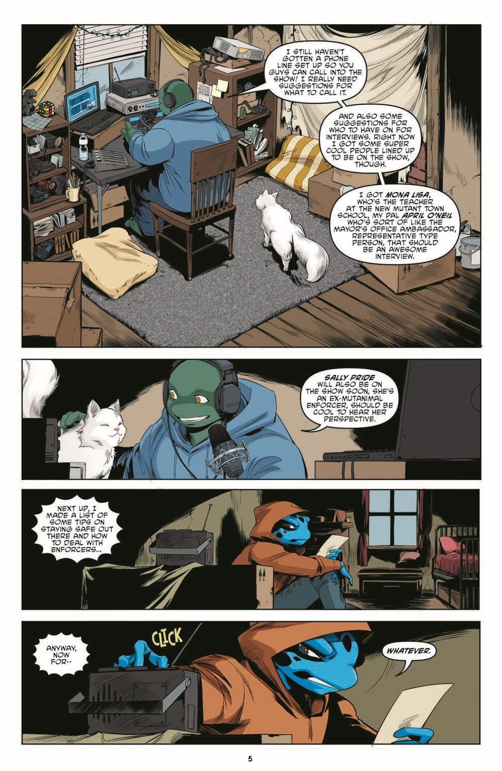 As Michelangelo takes to the airwaves, the citizens of Mutant Town express their grievances with both the Turtles and the Mutanimals. Meanwhile, Karai searches for two new powerful mutants who could tip the balance of power in New York City, and a familiar character from the future arrives with a most unusual quest. Plus, the return of Casey Jones and Bebop and Rocksteady!