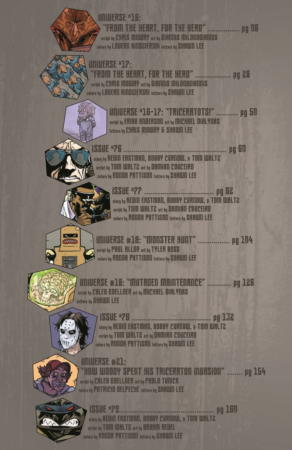 Presenting the complete TMNT stories in recommended reading order, including one-shots, crossovers, and event series. Everything a beginner could need, everything a diehard could want. Collects Teenage Mutant Ninja Turtles Universe issues #16–22 and issues #76–84 of the ongoing Teenage Mutant Ninja Turtles series.