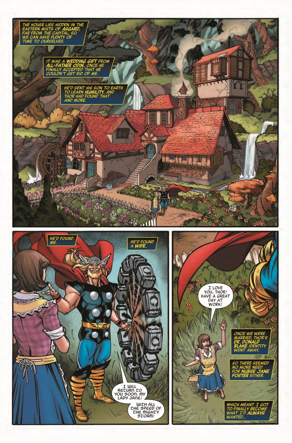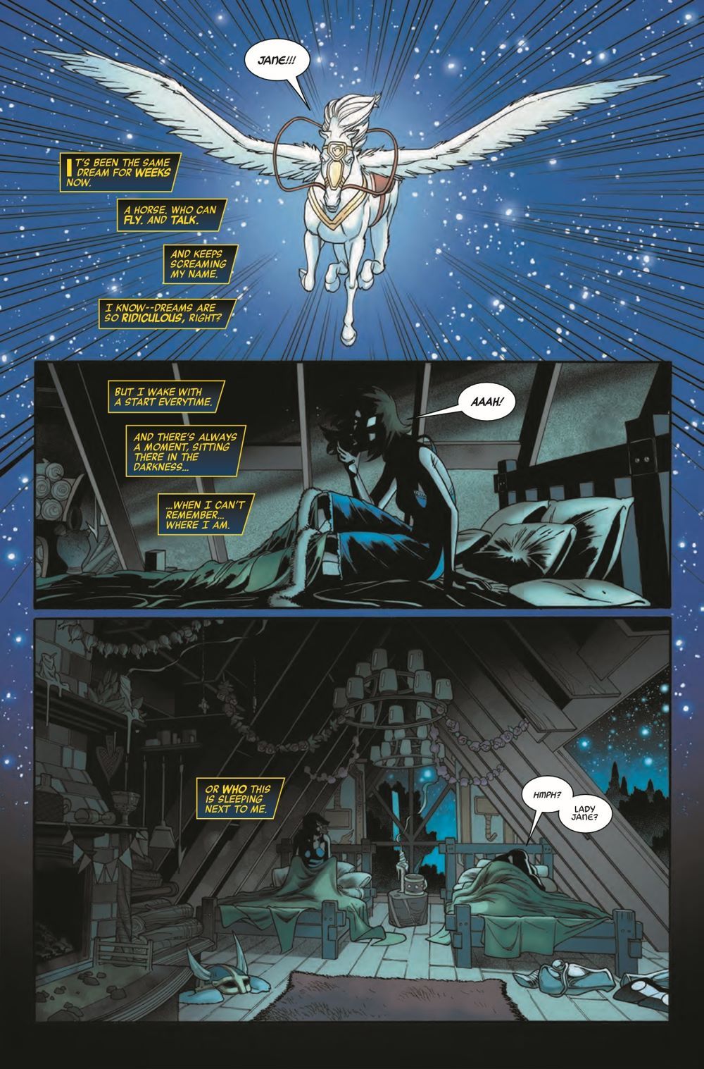 JANE FOSTER TAKES THE SPOTLIGHT! She once famously wielded Mjolnir as Thor, Goddess of Thunder. Today, she guards the worlds of the living and the dead as the winged Valkyrie. Now, those two versions of the same mighty hero somehow find themselves face-to-face, in a desperate bid to save the soul of Jane Foster.