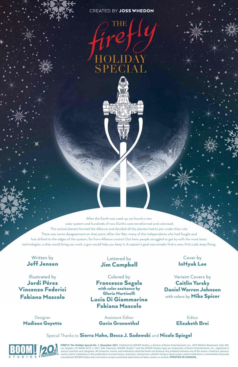 SPECIAL ISSUE. It's the holiday season and Jayne's selfish behavior receives the unwanted attention of three visiting spirits who reveal the hidden past, present and future of Serenity's most...miserly crew member. A beloved character returns as the Ghost of Firefly Past, while a fellow crew member guides Jayne through the here and now, showing the consequences of his actions in the present. But it's the Ghost of Firefly Future, Emma Washburne, who reveals the most shocking fate of all. Can Jayne turn over a new leaf and avert the disaster headed his way? Celebrate the holiday season with your favorite Browncoats in this self-contained special by Emmy and Eisner Award-winning writer Jeff Jensen (HBO's Watchmen, Better Angels: A Kate Warne Adventure) and artists Vincenzo Federici (Go-Go Power Rangers), Jordi Perez (Firefly), & Fabiana Mascolo (Firefly: Brand New 'Verse).