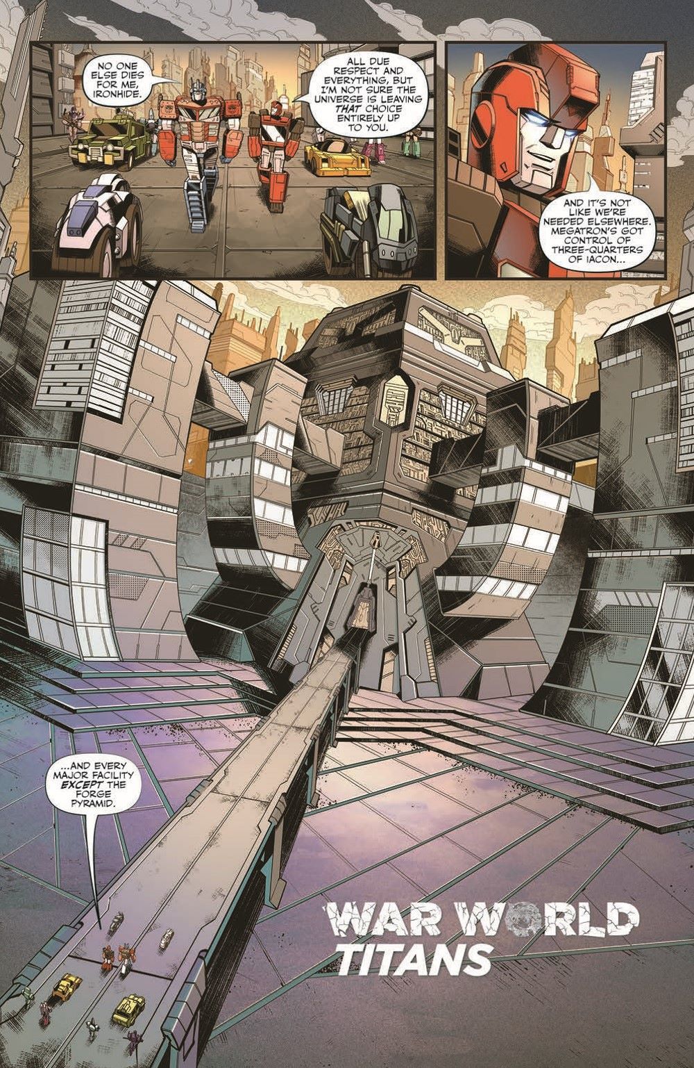 "War World: Titans"! Sentinel Prime has a secret—something that could change the fate of Cybertron—something that Megatron wants. It's a battle for control of the Forge as the Autobots and the Decepticons come face-to-face in battle for the first time!