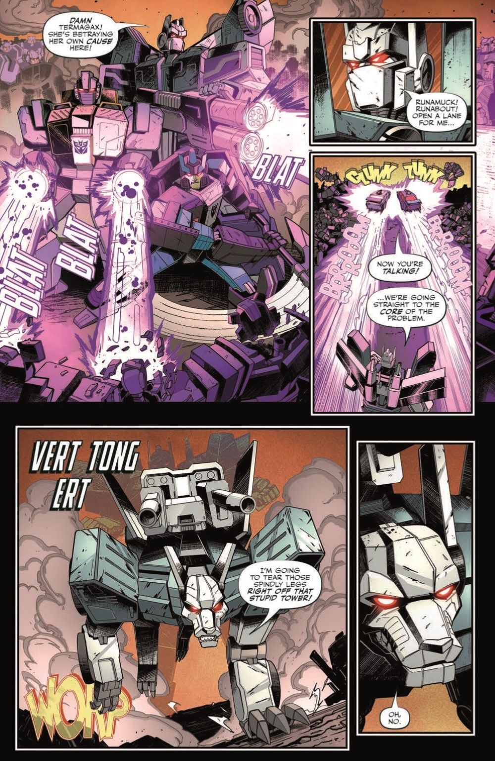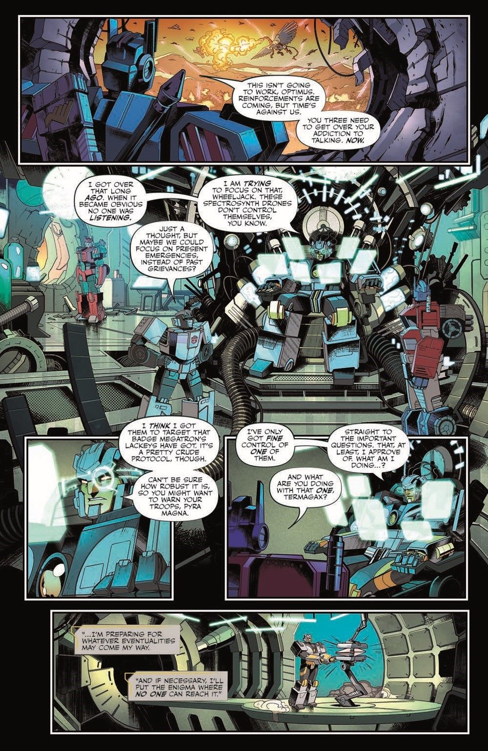"Sea of Rust," part two! Termagax has many secrets–information that could forever tip the scales in the favor of the Autobots or the Decepticons. As the Decepticons close in, she allows Optimus Prime and the two other Autobots she respects into her inner sanctum to share her knowledge. But will the Autobots be able to act on it before the Decepticons start their siege? And where does Skywarp factor into the equation?
