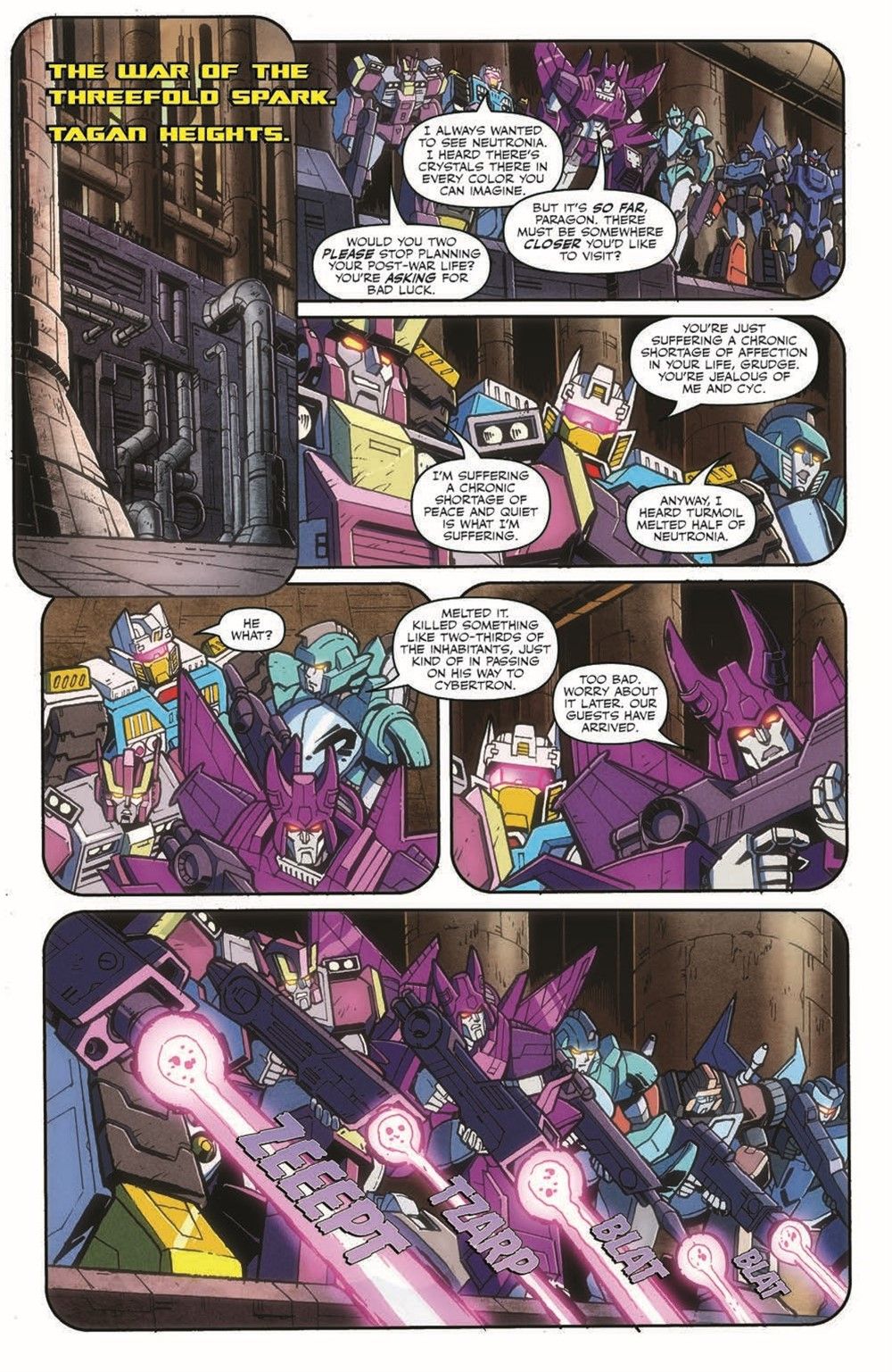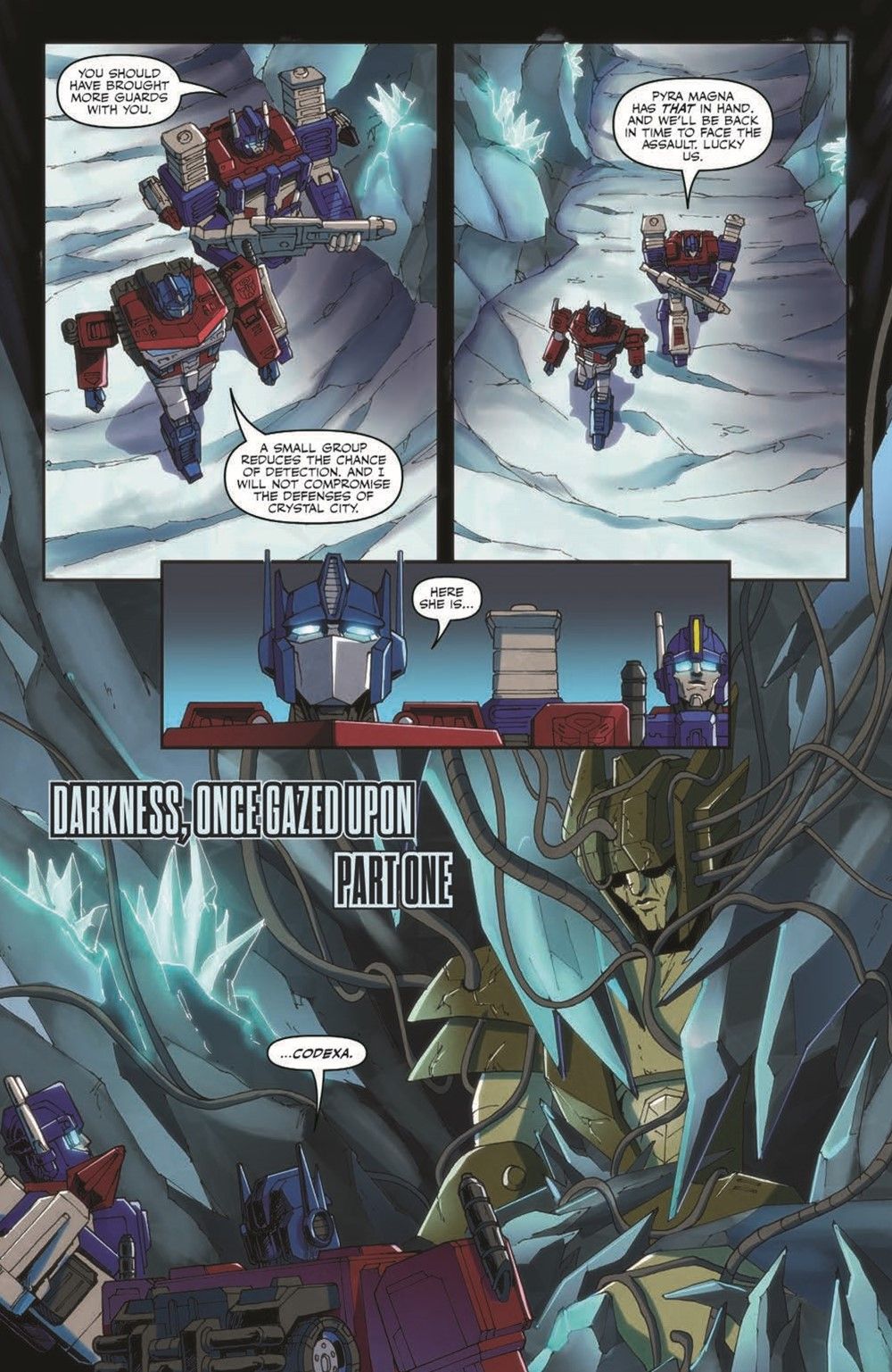 "War Stories." 2000 years ago, the War of the Three-Fold Spark came to a close, ending an unprecedented era of violence on Cybertron and clearing a way for a bold new era. But two kilocycles is practically nothing to the incredibly long-lived Cybertronians, so what answers can Cyclonus and Pyra Magna find in their past to help them survive the new battles of the present?