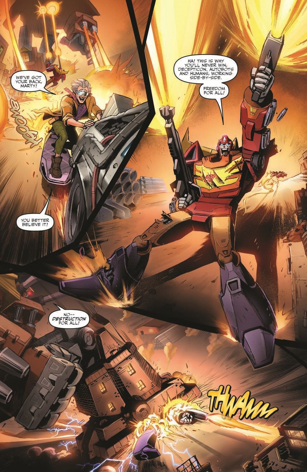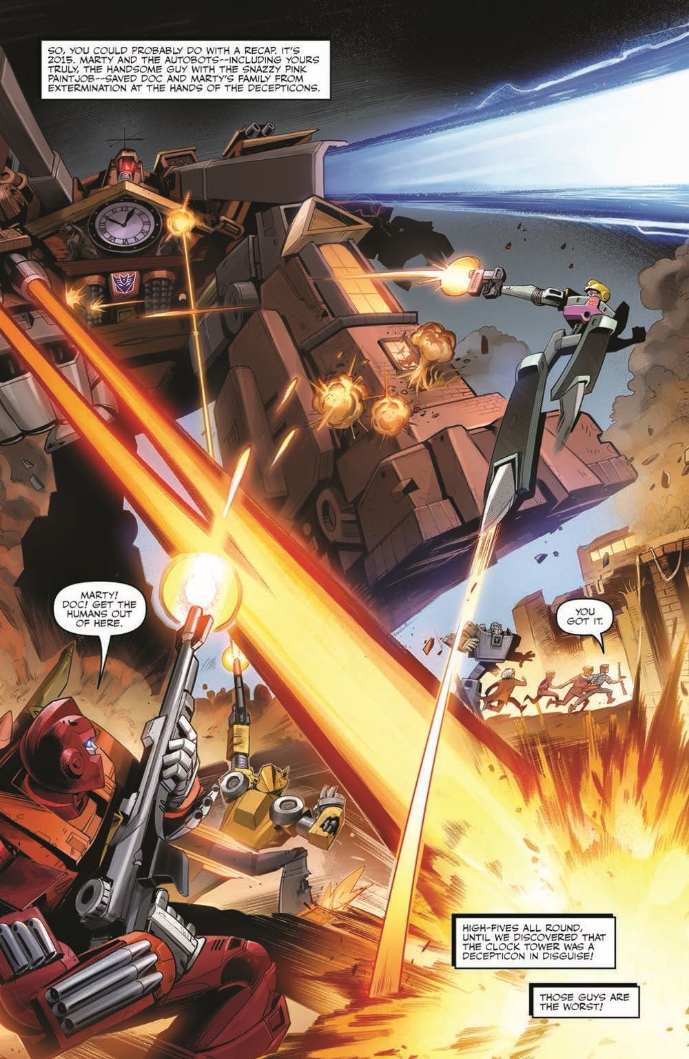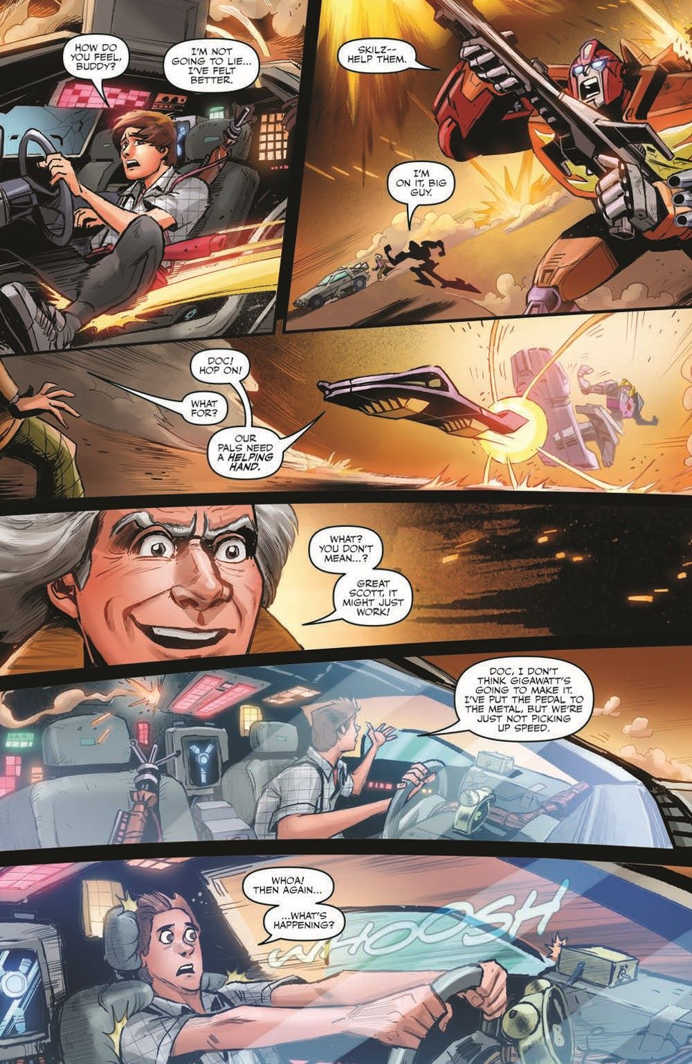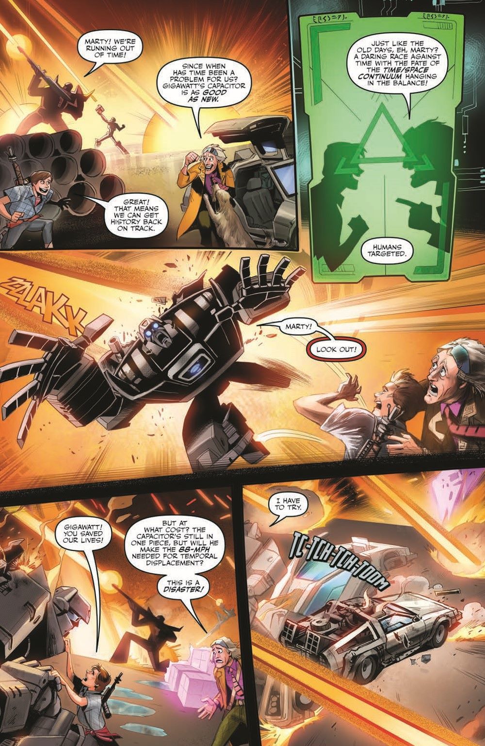 Outmatched by the Decepticons, running on empty, and on the ropes, Marty McFly and the Autobot Gigawatt show why nobody calls them chicken! Will the final confrontation be in Marty's future, or will he and his companions make it back to fix the timestream before the Decepticons win? Find out in the heaviest issue of the whole series!