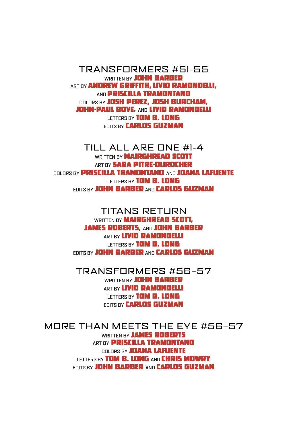 Collects Transformers #51-57, Transformers: Till All Are One #1-4, Titans Return #1, and Transformers: More Than Meets The Eye #56-57.