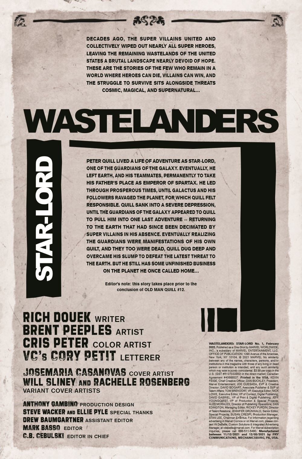 PETER QUILL HAUNTED BY HIS PAST! The legendary STAR-LORD has fallen on hard times. With the GUARDIANS OF THE GALAXY disbanded, PETER QUILL returned to Earth to find it a wasteland unlike anything he's seen across the stars - heroes dead, villains in power. While he's taken out one threat, others remain in the Wastelands, and Star-Lord's own desire to assuage his guilt for being off-world during the calamity will land him right in the middle of another! Will Quill overcome the MYSTERIOUS FORCE waiting for him at the site of his lost love's death? Or is she not really dead at all?