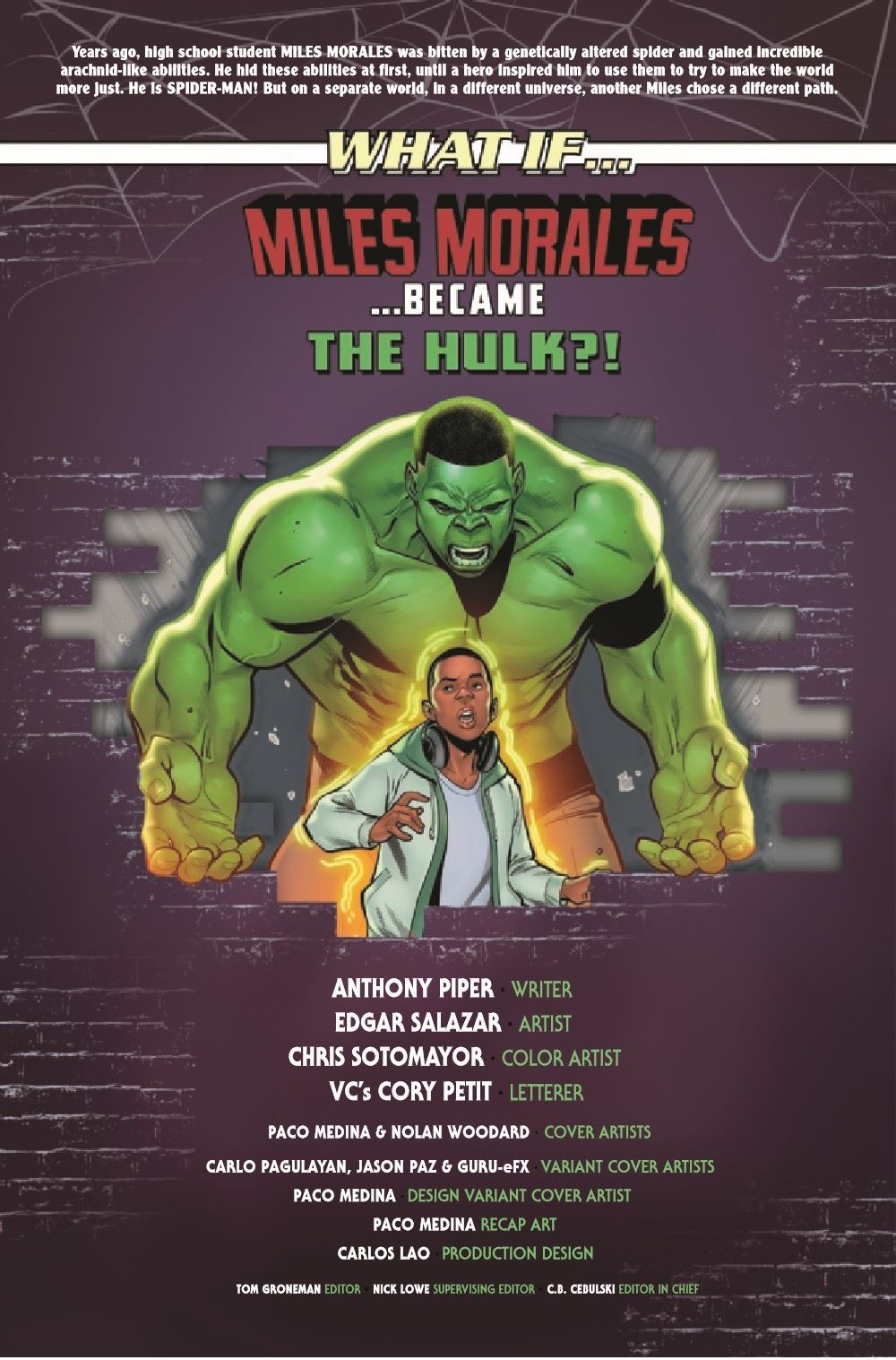 DON'T MAKE HIM ANGRY... What if…instead of being bitten by a genetically enhanced spider, Miles Morales was blasted by gamma radiation and transformed into THE INCREDIBLE HULK?! Is Miles man or monster? Or maybe he's just a kid trying to live a normal life…school, dates, a rampaging ABOMINATION… Miles may be the strongest there is, but that doesn't mean growing up will be easy.