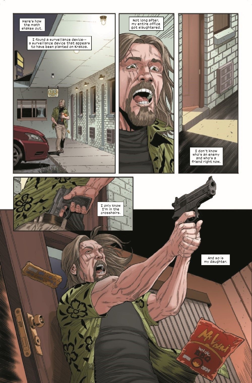 KRAKOA COMPROMISED! You've seen some action in Benjamin Percy's WOLVERINE, but never quite like this! It's a life-or-death protection mission as WOLVERINE goes on the run with his friend C.I.A. Agent Jeff Bannister when a secret surveillance device is discovered on Krakoa - and its owners are willing to kill to get it back! But who would go so far as to betray the mutants? Featuring the return of some unexpected adversaries!