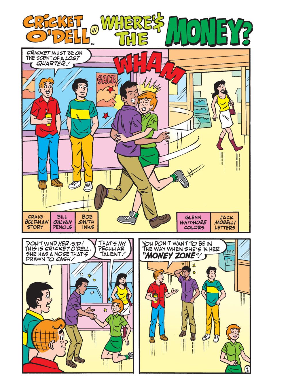 Then, in "Where'$ the Money?" Cricket O'Dell, with her unerring nose for money, keeps being drawn to a new visitor to Riverdale who, by all appearances, is virtually a pauper. She can't figure it out. Veronica notices this and is intrigued. She deduces that the new guy must be a secret billionaire, and makes it her project to win him over. Will Veronica find out his true identity? Or is Cricket's nose's losing its secret powers?