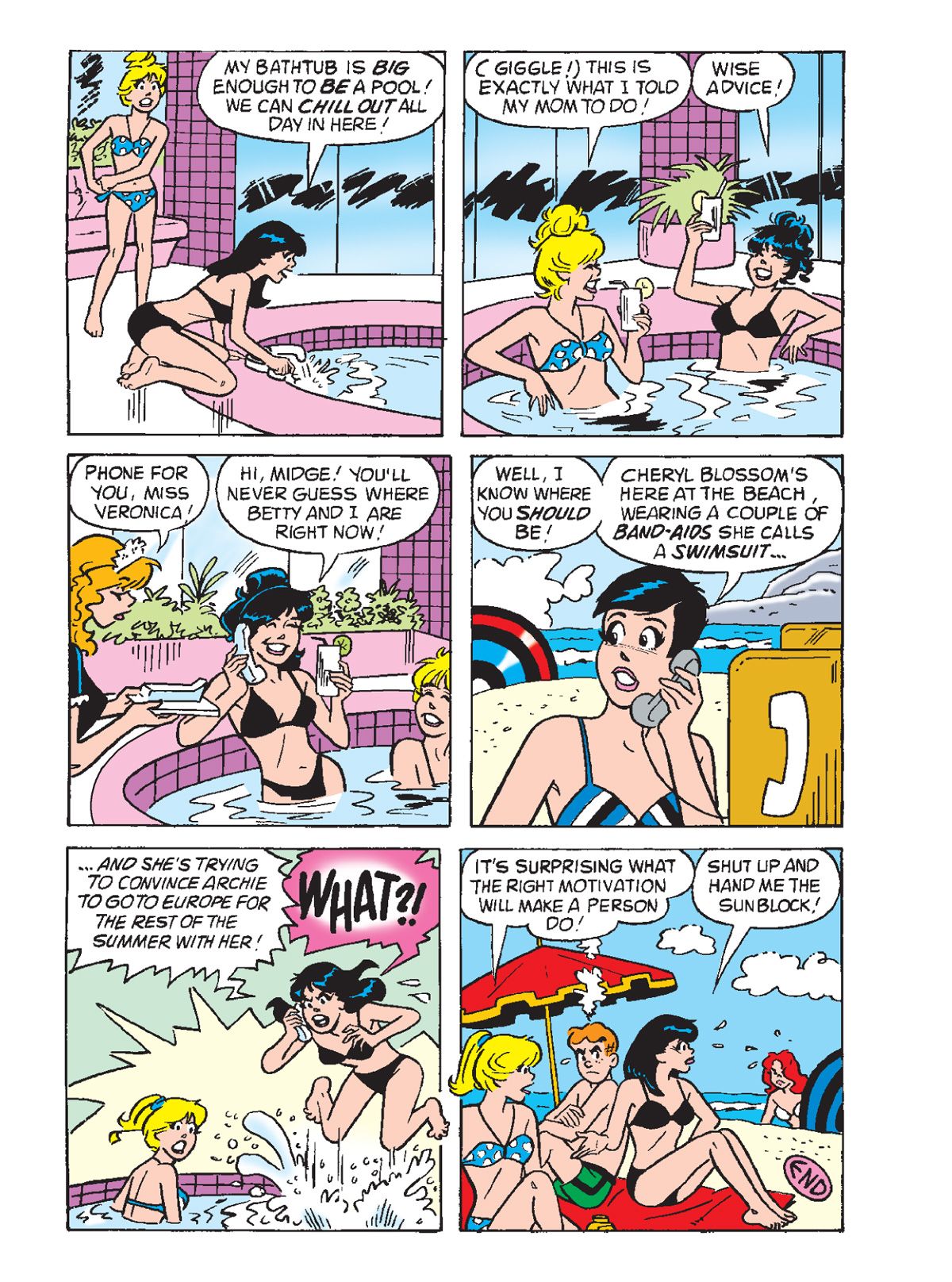 TWO BRAND NEW STORIES: First, in "Put a Cork in it!" Betty and Veronica discover a bottle that washes up on the beach. Thinking there may a note inside, they open it… and a beautiful genie emerges! She doesn't offer to grant them any wishes but just wants to have a good time after being bottled up for ages. It would be a lot of fun… until she sets her sights on Archie! Can Betty & Veronica successfully get the genie BACK into her bottle?