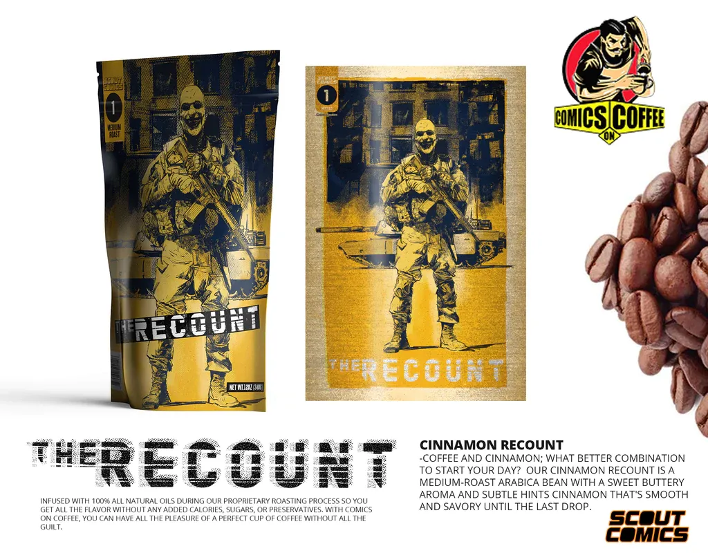 One of the first releases will be a metal cover comic and 12 ounce coffee combo pack of the ultra popular comic THE RECOUNT, A limited edition (individually numbered out of 100) metal cover is now available while supplies last at www.scoutcomics.com.