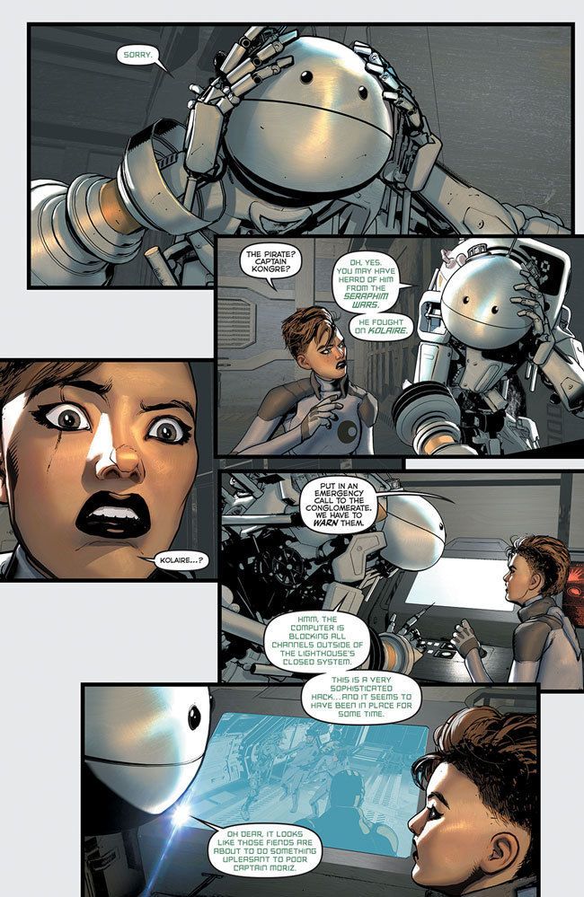Jules Verne's: Lighthouse is set at the edge of the galaxy, where there is a giant supercomputer known as the Lighthouse. The only brain powerful enough to navigate ships through a sargasso of naturally occurring wormholes, potentially cutting months or even years off a spaceship's journey. Three humans, one alien, and a nanny bot have manned the remote station for years in relative peace until the arrival of Captain Kongre and his band of cutthroat pirates threatens the future of civilization and reveals that each of the Lighthouse crew has been hiding a shocking secret.