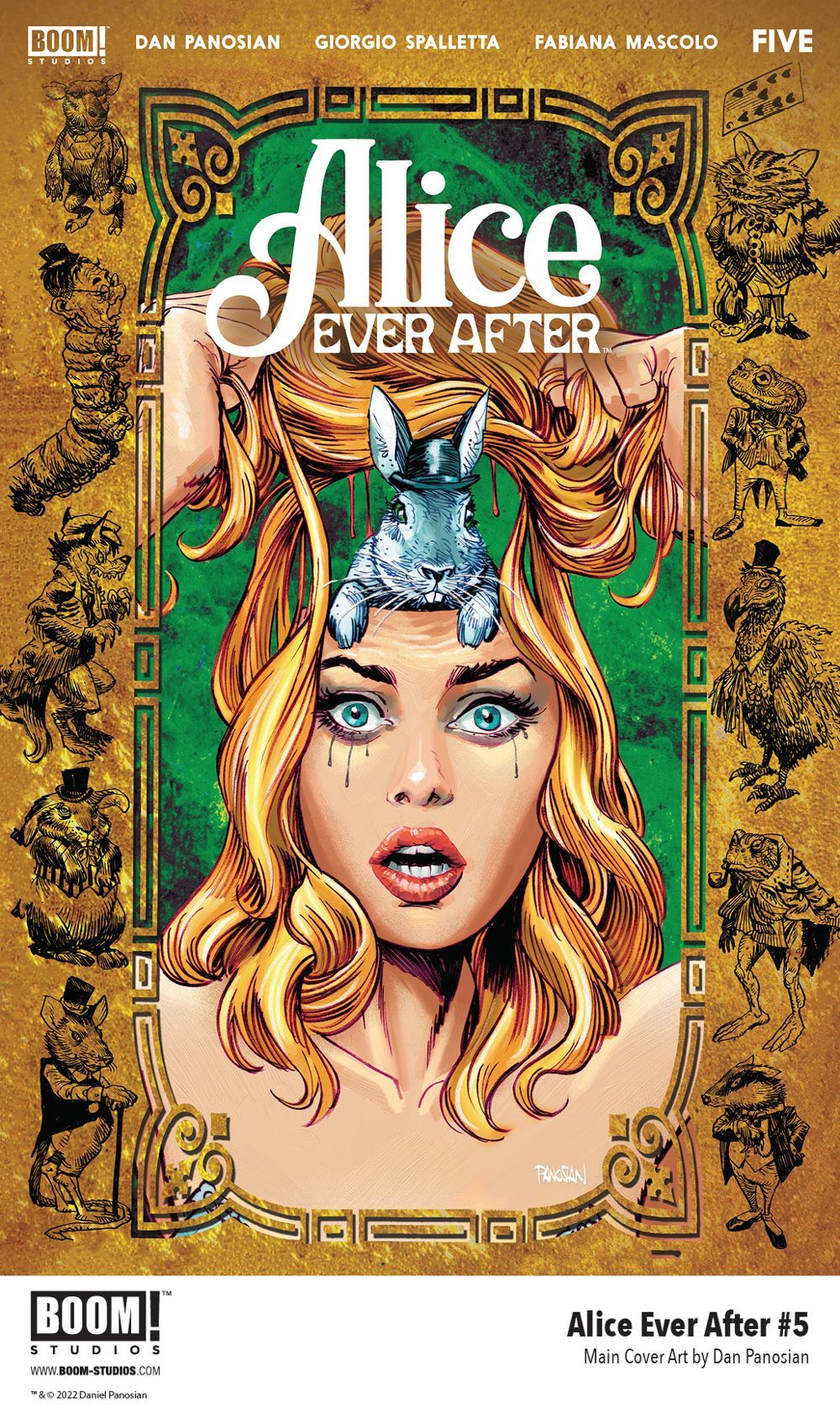Media Release -- BOOM! Studios today revealed a first look at ALICE EVER AFTER #5, the final issue of the new five-issue original series from superstar artist and writer Dan Panosian (An Unkindness of Ravens, Canary), artist Giorgio Spalletta (Red Sonja: Black, White, Red), colorist Fabiana Mascolo, and letterer Jeff Eckleberry, a darkly surreal tale of an adult Alice as she struggles with a choice between facing her trauma in the real world, or escaping to Wonderland... for good. Available in August 2022.