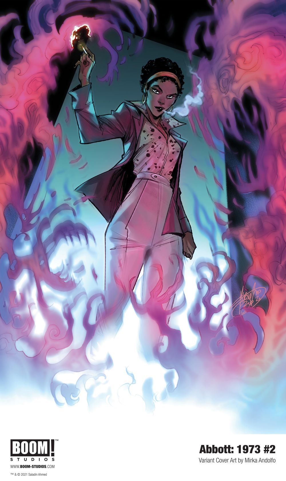 Print copies of ABBOTT: 1973 #2, featuring cover art by Taj Tenfold (Lovecraft Country), Raúl Allén (Dune: The Graphic Novel), and Mirka Andolfo (Mercy), will be available for sale on February 17, 2021 exclusively at local comic book shops (use comicshoplocator.com to find the nearest one) or at the BOOM! Studios webstore. Digital copies can be purchased from content providers, including comiXology, iBooks, Google Play, and Madefire.