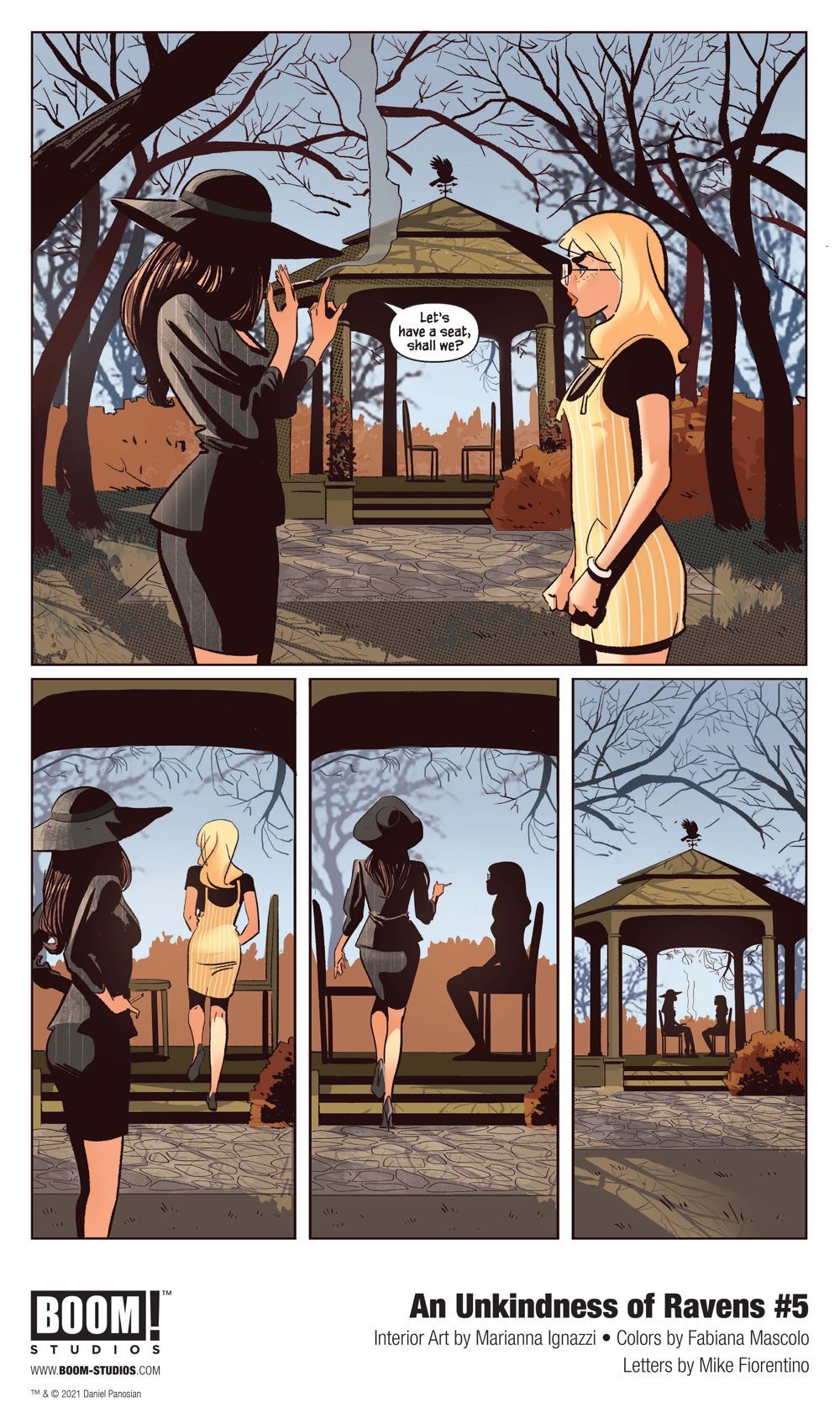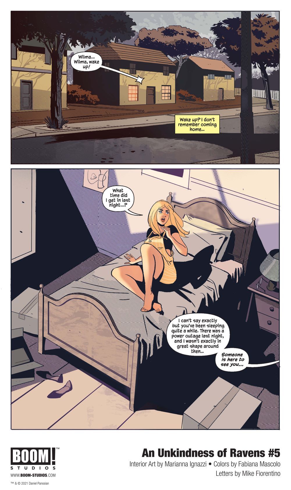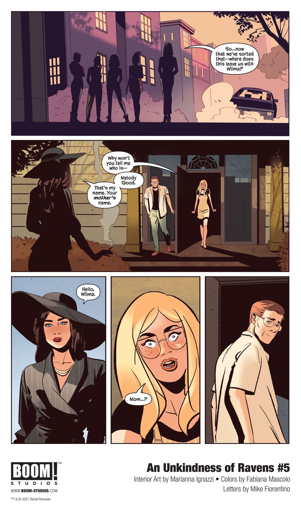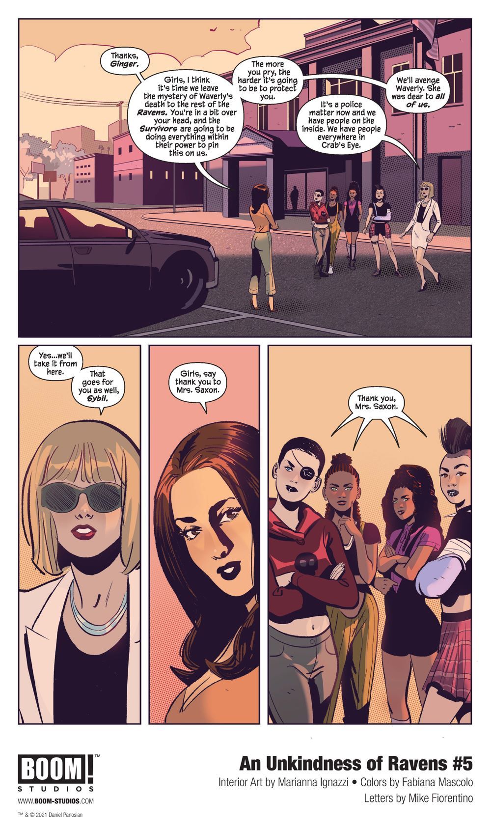 Media Release -- BOOM! Studios today revealed a first look at AN UNKINDNESS OF RAVENS #5, the series finale of the original series from acclaimed comics creator Dan Panosian (Slots), artist Marianna Ignazzi, colorist Fabiana Mascolo, and letterer Mike Fiorentino, a supernatural mystery about a group of high schoolers steeped in witchcraft and the town they live in filled with long-hidden secrets and unchecked power. Available on January 27, 2021.