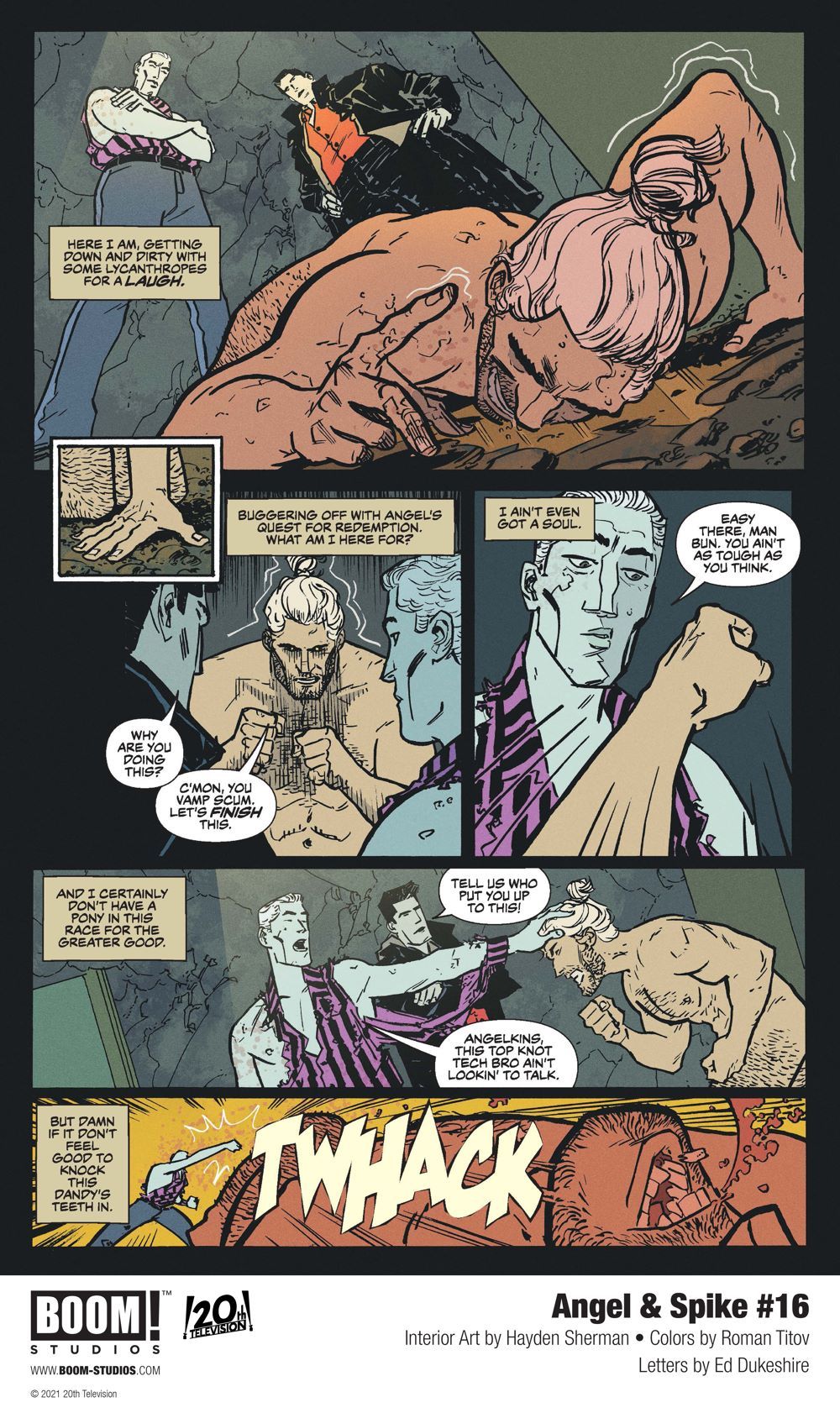 Media Release -- BOOM! Studios, in partnership with 20th Television, revealed a first look ANGEL & SPIKE #16, from acclaimed writer Zac Thompson (Spider-Geddon: Edge of Spider-Geddon), artist Hayden Sherman (Thumbs, The Few), colorist Roman Titov (Angel), and letterer Ed Dukeshire (Angel) along with visionary writer and director Joss Whedon (Buffy the Vampire Slayer, Marvel's The Avengers), available in November 2020.