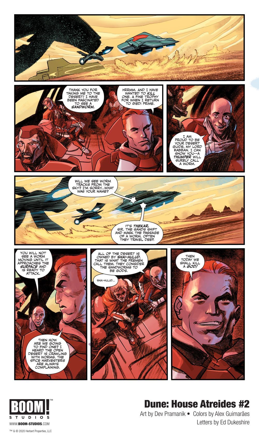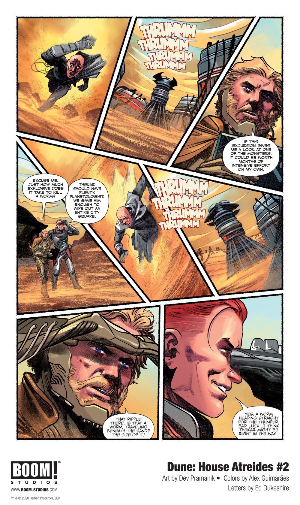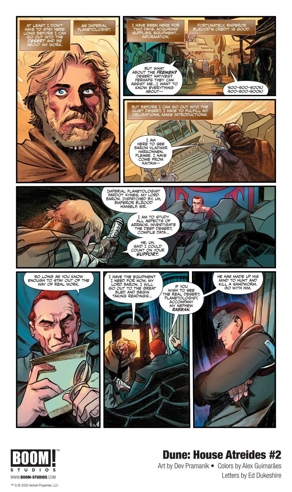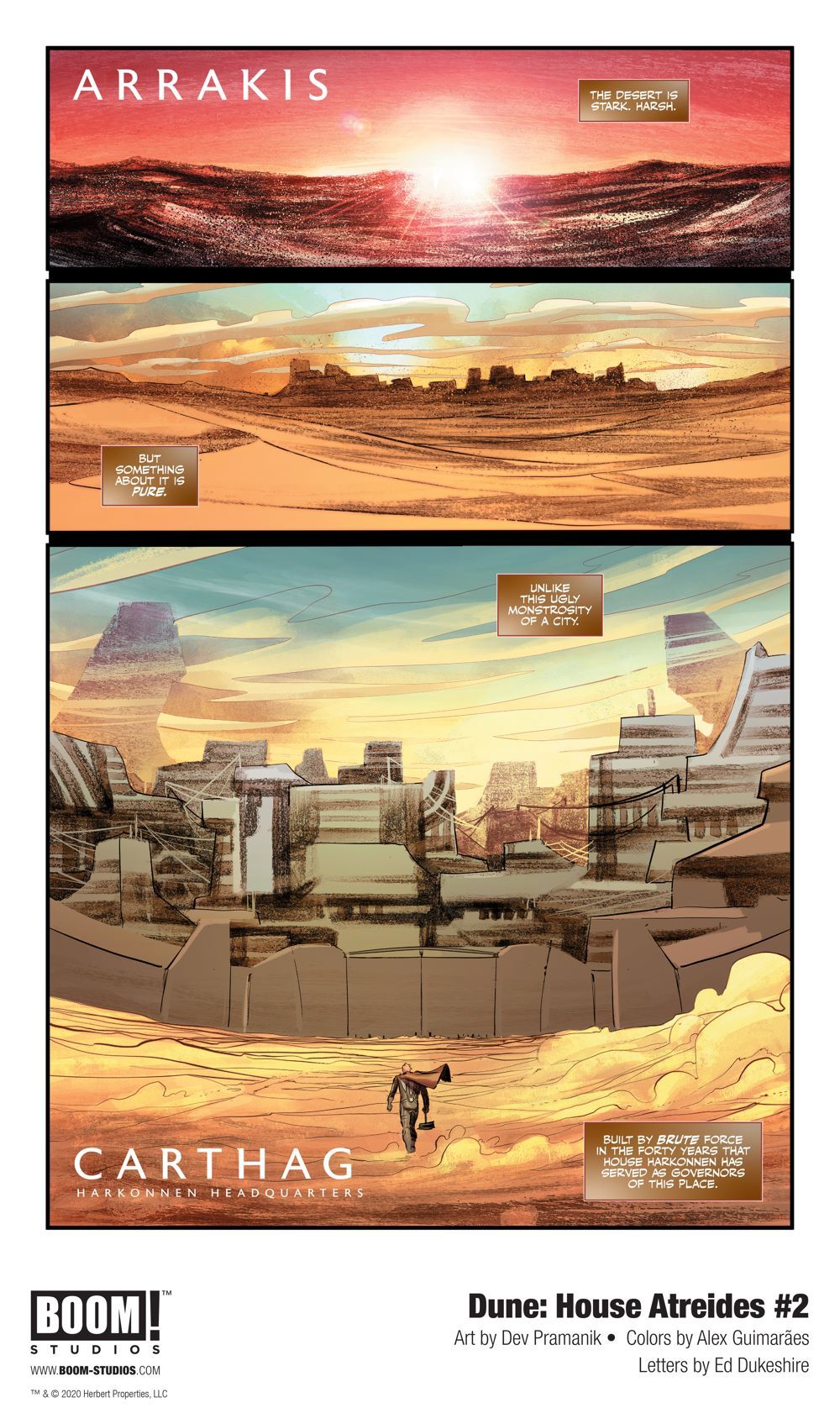 Media Release -- BOOM! Studios today revealed a first look at DUNE: HOUSE ATREIDES #2, adapted & scripted by Brian Herbert and Kevin J. Anderson, who co-wrote the eponymous prequel novel based on Frank Herbert's notes and illustrated by artist Dev Pramanik (Paradiso), colorist Alex Guimarães and letterer Ed Dukeshire, in partnership with Herbert Properties LLC and in full coordination with Abrams ComicArts, who are publishing in the fall the first of three graphic novel adaptations of Herbert's original classic novel DUNE.