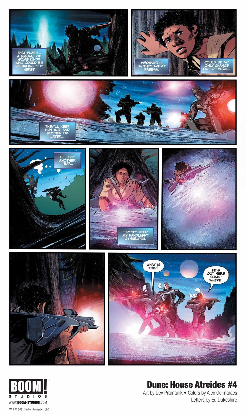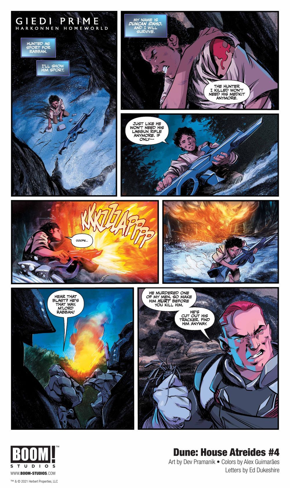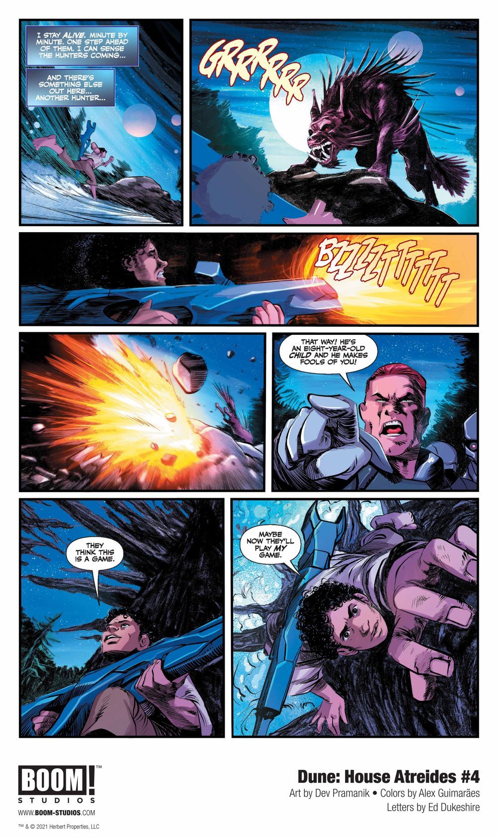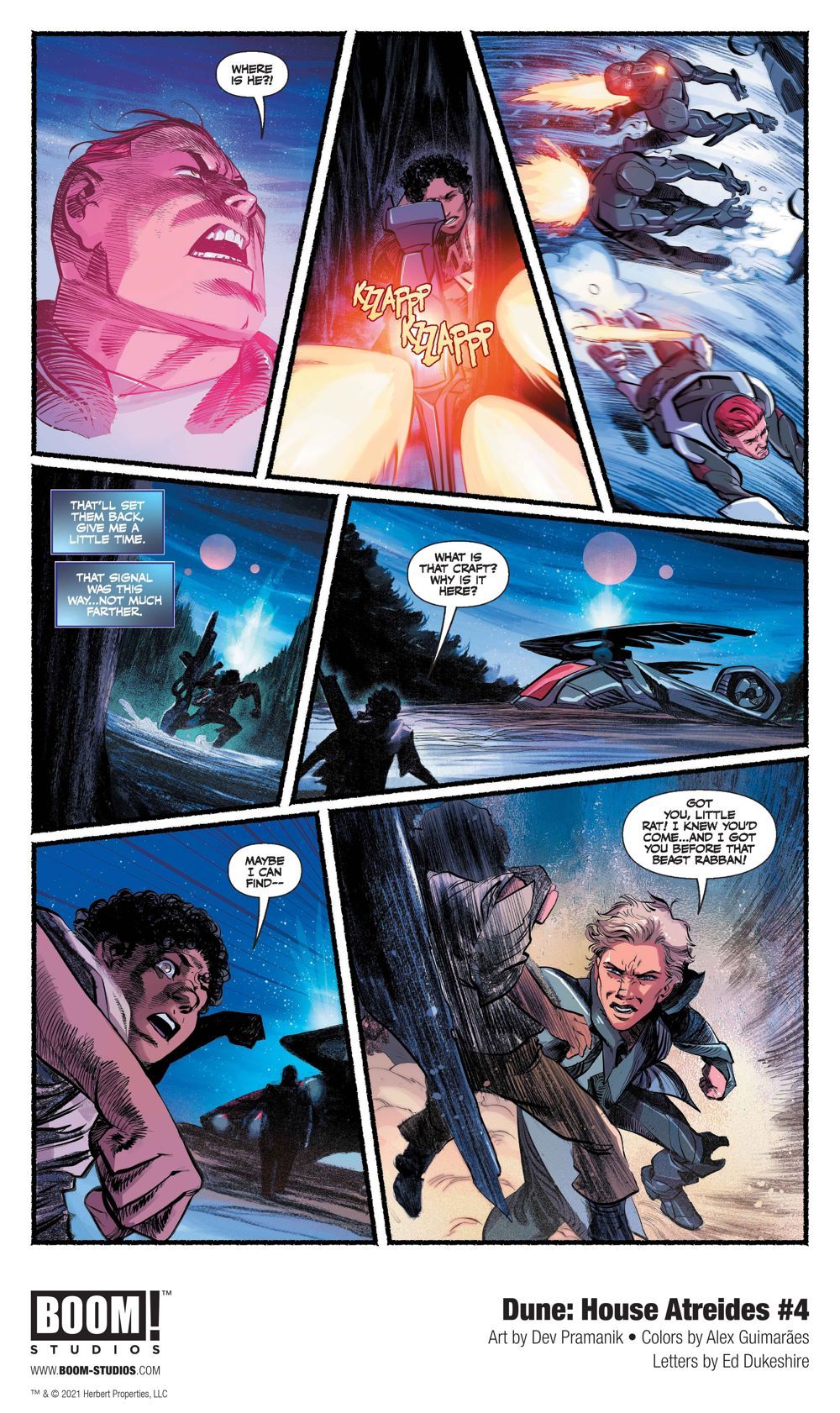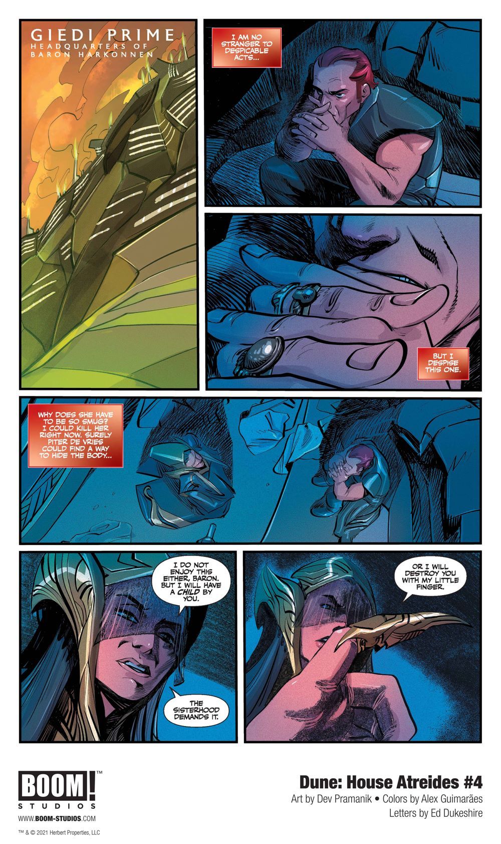 Media Release -- BOOM! Studios today revealed a first look at DUNE: HOUSE ATREIDES #4, adapted & scripted by Brian Herbert and Kevin J. Anderson, who co-wrote the eponymous prequel novel based on Frank Herbert's notes and illustrated by artist Dev Pramanik (Paradiso), colorist Alex Guimarães (Buffy: Every Generation) and letterer Ed Dukeshire (Once & Future), in partnership with Herbert Properties LLC and in full coordination with Abrams ComicArts, who published the first of three graphic novel adaptations of Herbert's original classic novel DUNE in Fall 2020.