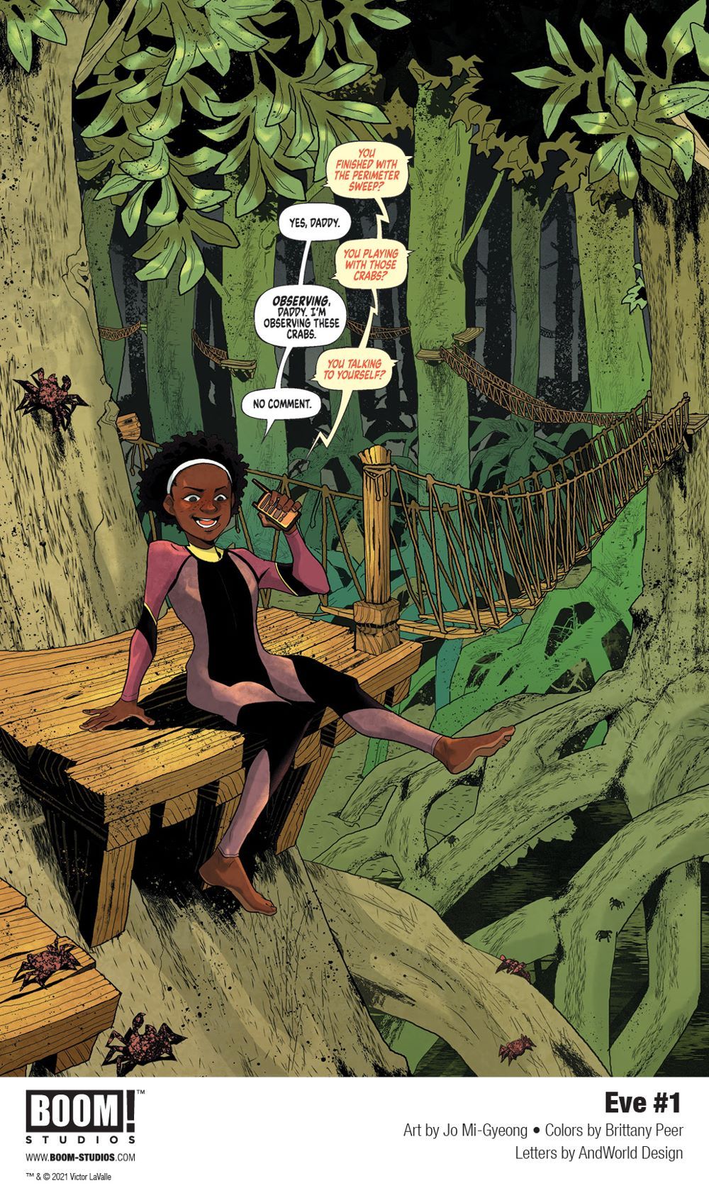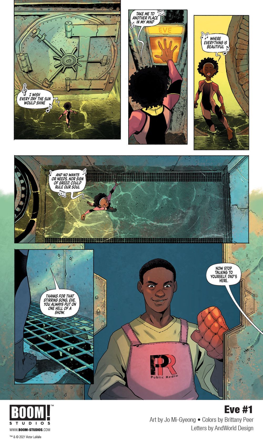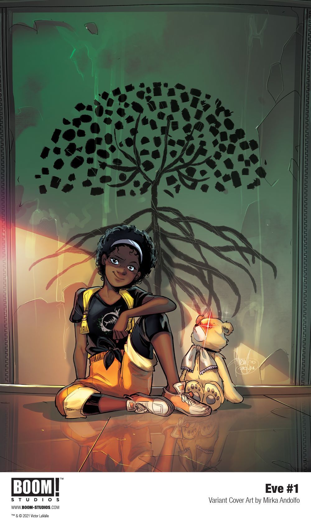 Print copies of EVE #1 will be available for sale on May 5, 2021 exclusively at local comic book shops (use comicshoplocator.com to find the one nearest you) or at the BOOM! Studios webstore. Digital copies can be purchased from content providers, including comiXology, iBooks, Google Play, and Madefire.
