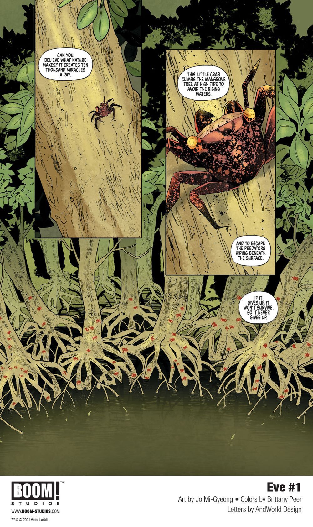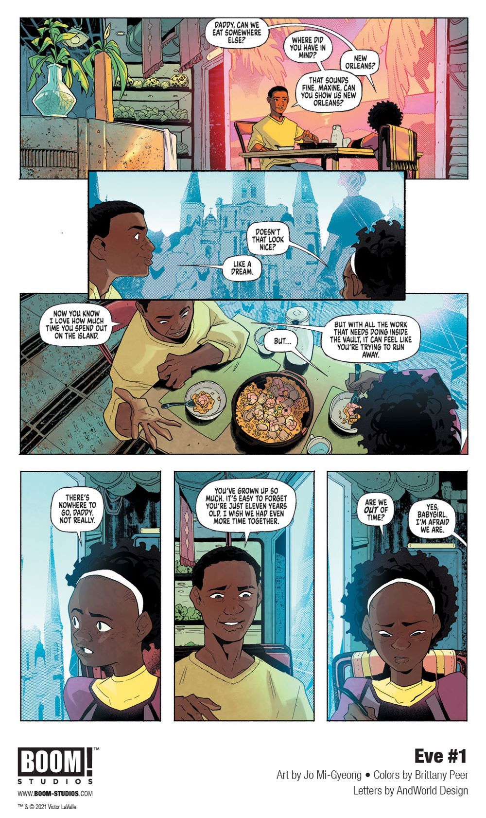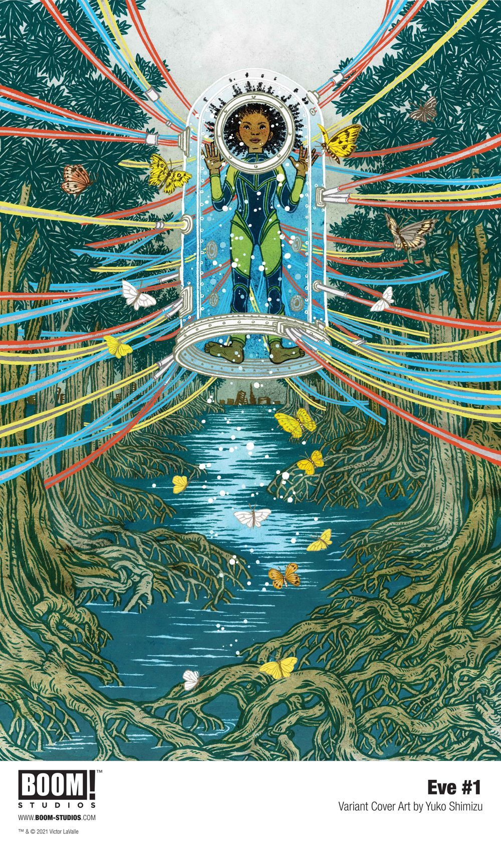 Print copies of EVE #1 will be available for sale on May 5, 2021 exclusively at local comic book shops (use comicshoplocator.com to find the one nearest you) or at the BOOM! Studios webstore. Digital copies can be purchased from content providers, including comiXology, iBooks, Google Play, and Madefire.