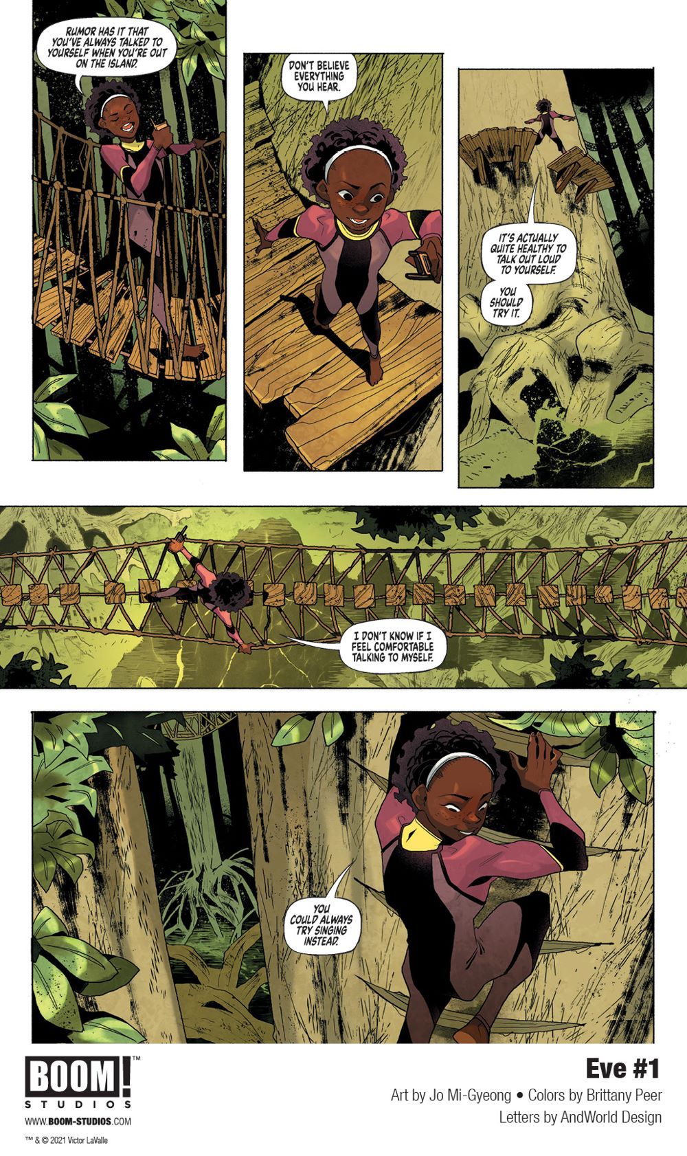 Media Release -- BOOM! Studios revealed a first look at EVE #1, a brand new five-issue original series from award-winning author Victor LaValle (Victor LaValle's Destroyer) and rising star artist Jo Mi-Gyeong (Jim Henson's The Dark Crystal: Age of Resistance), with colorist Brittany Peer and letterer AndWorld Design, about a dangerous journey across a future dystopian America to save the world, available in May 2021.