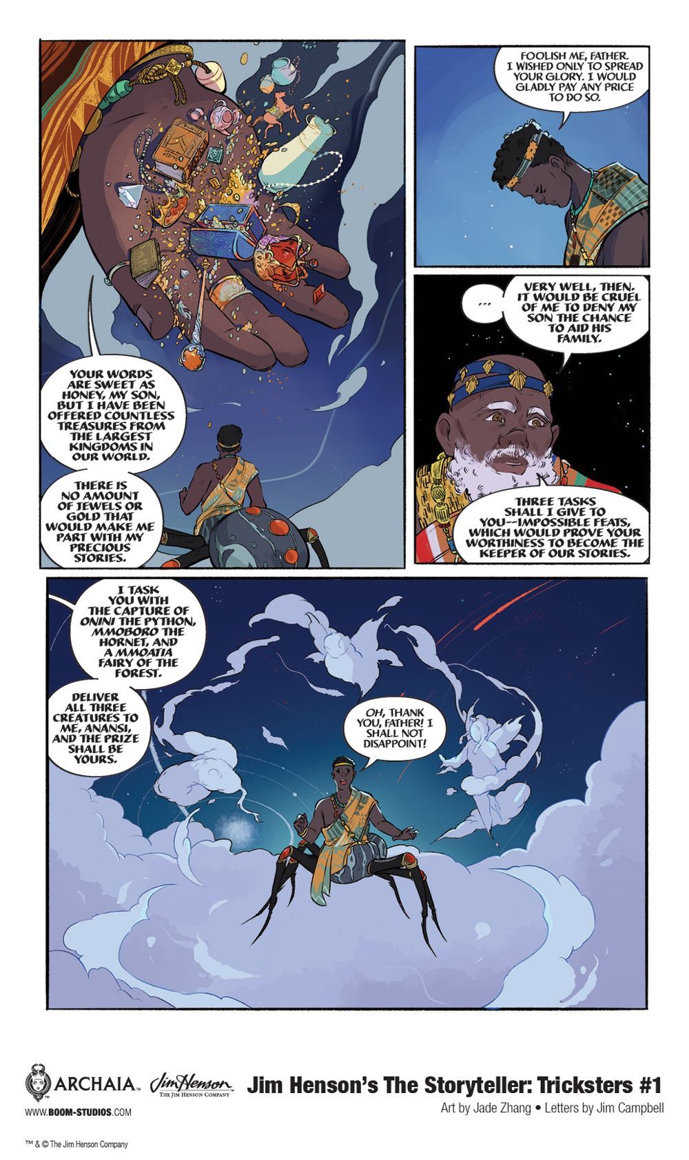 Media Release -- BOOM! Studios revealed today the first look of JIM HENSON'S THE STORYTELLER: TRICKSTERS #1, the first issue of a new comic book series based on the Emmy Award-winning classic television show, Jim Henson's The Storyteller, presenting several extraordinary folk tales of legendary tricksters from the four corners of the world. Each issue will feature a new creative team, with the first issue, by writer Jonathan Rivera (Cave Carson Has a Cybernetic Eye), artist Jade Zhang, and letterer Jim Campbell, featuring the most famous trickster of all—Anansi, available in March 2021.