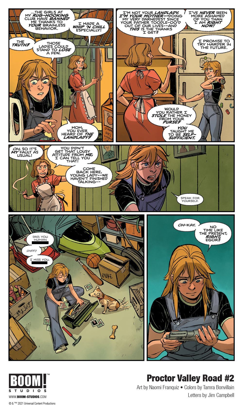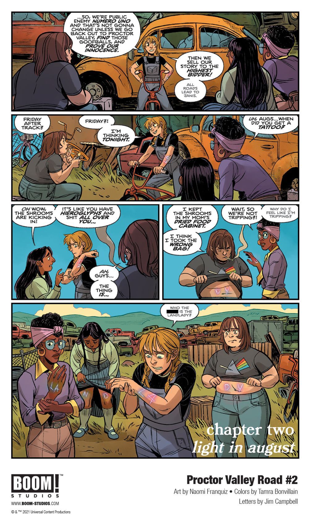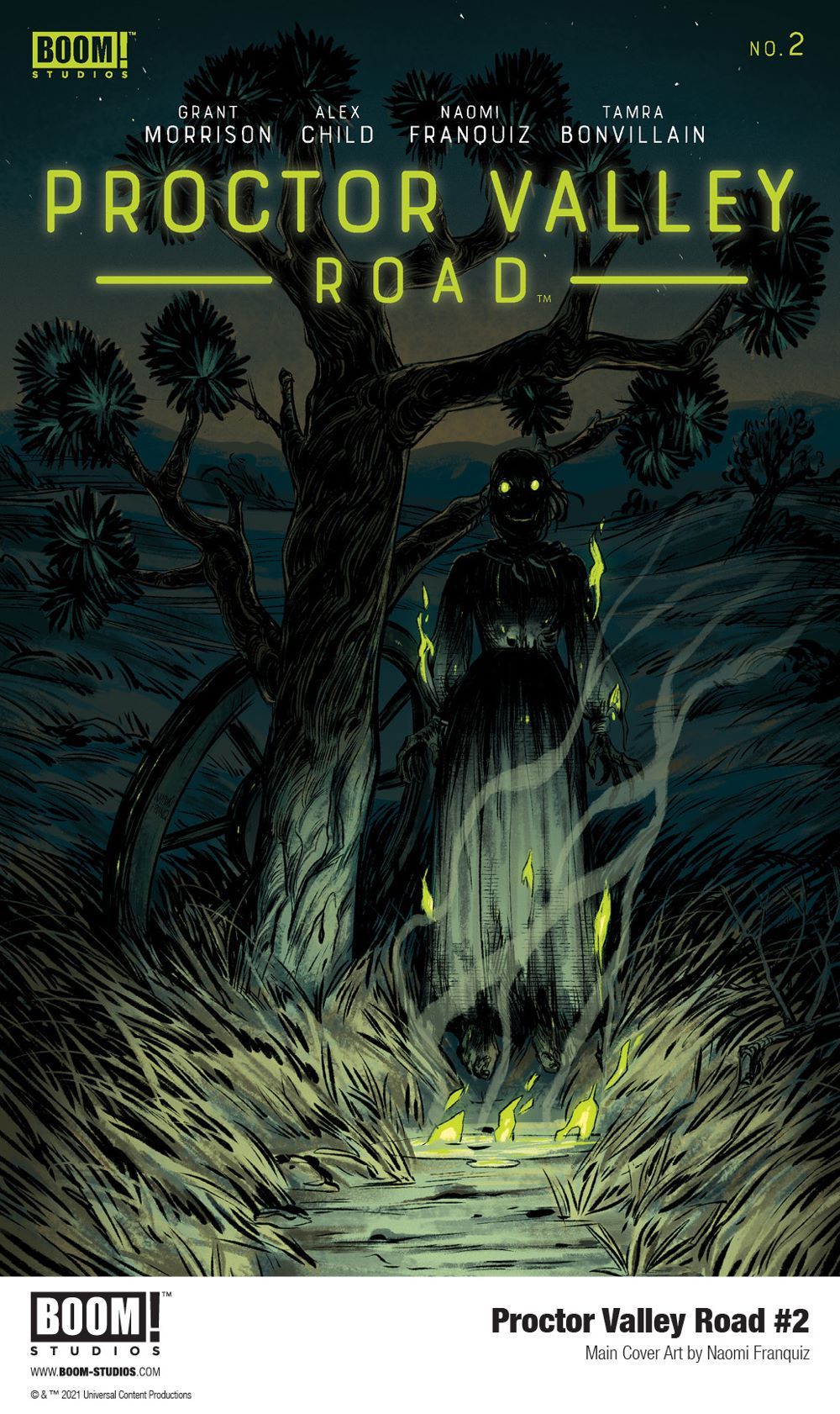 Media Release -- BOOM! Studios today revealed a first look at PROCTOR VALLEY ROAD #2, the next issue of the star-studded new horror limited series from visionary writer Grant Morrison (Klaus), Alex Child (BBC's Holby City), Naomi Franquiz (Tales from Harrow County) and Tamra Bonvillain (Once & Future) about the mysterious monsters that haunt Proctor Valley Road - and the four misfit teenagers who must stop them. PROCTOR VALLEY ROAD #2, developed in partnership with UCP Graphic, is available on April 14, 2021.