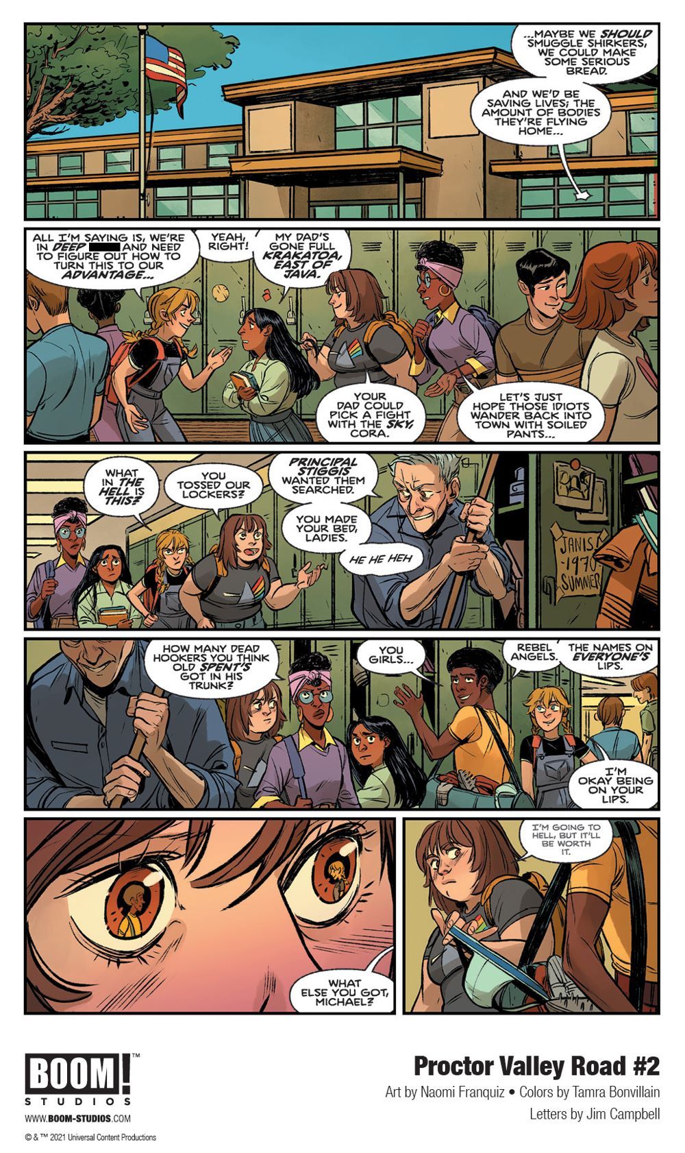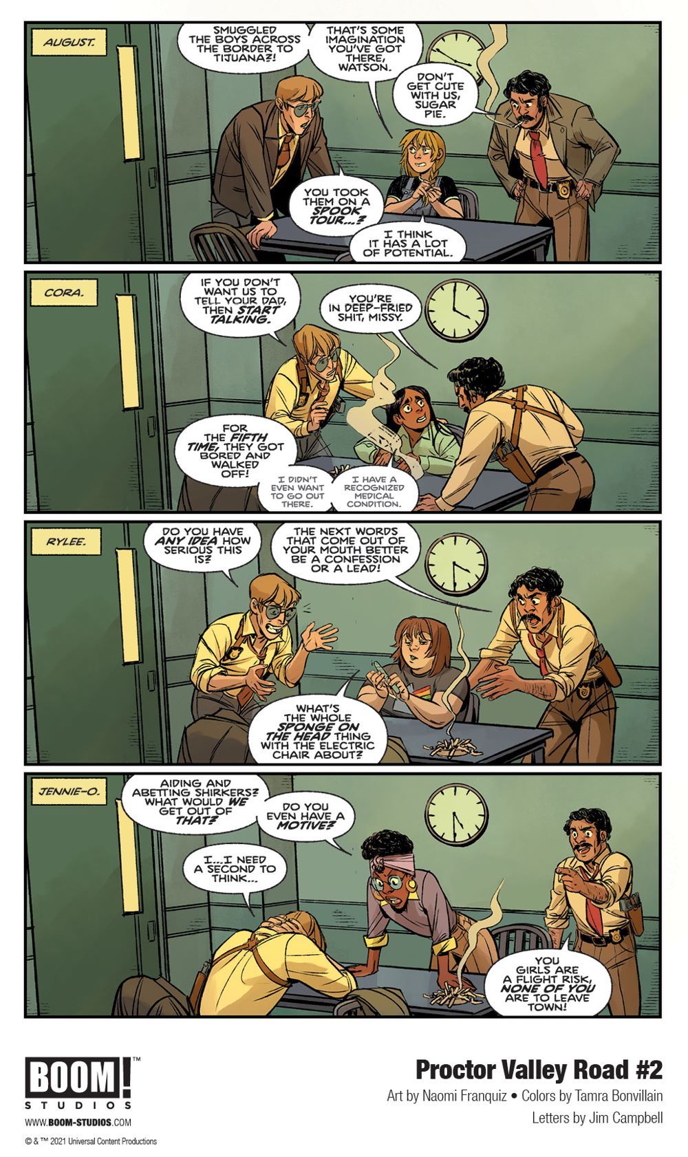 Print copies of PROCTOR VALLEY ROAD #2, for mature readers, will be available on April 14, 2021 exclusively at local comic book shops (use comicshoplocator.com to find the one nearest you) or at the BOOM! Studios webstore. Digital copies can be purchased from content providers like comiXology, iBooks, Google Play, and Madefire.